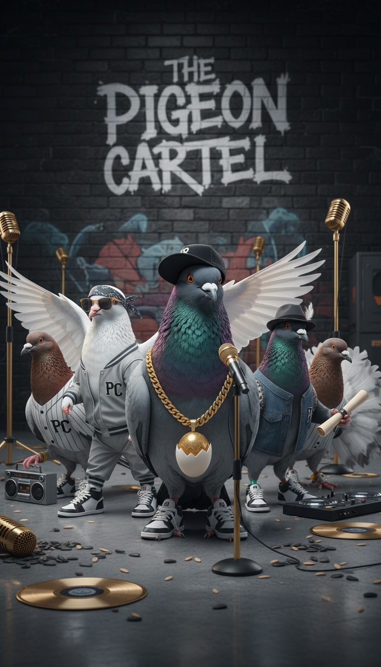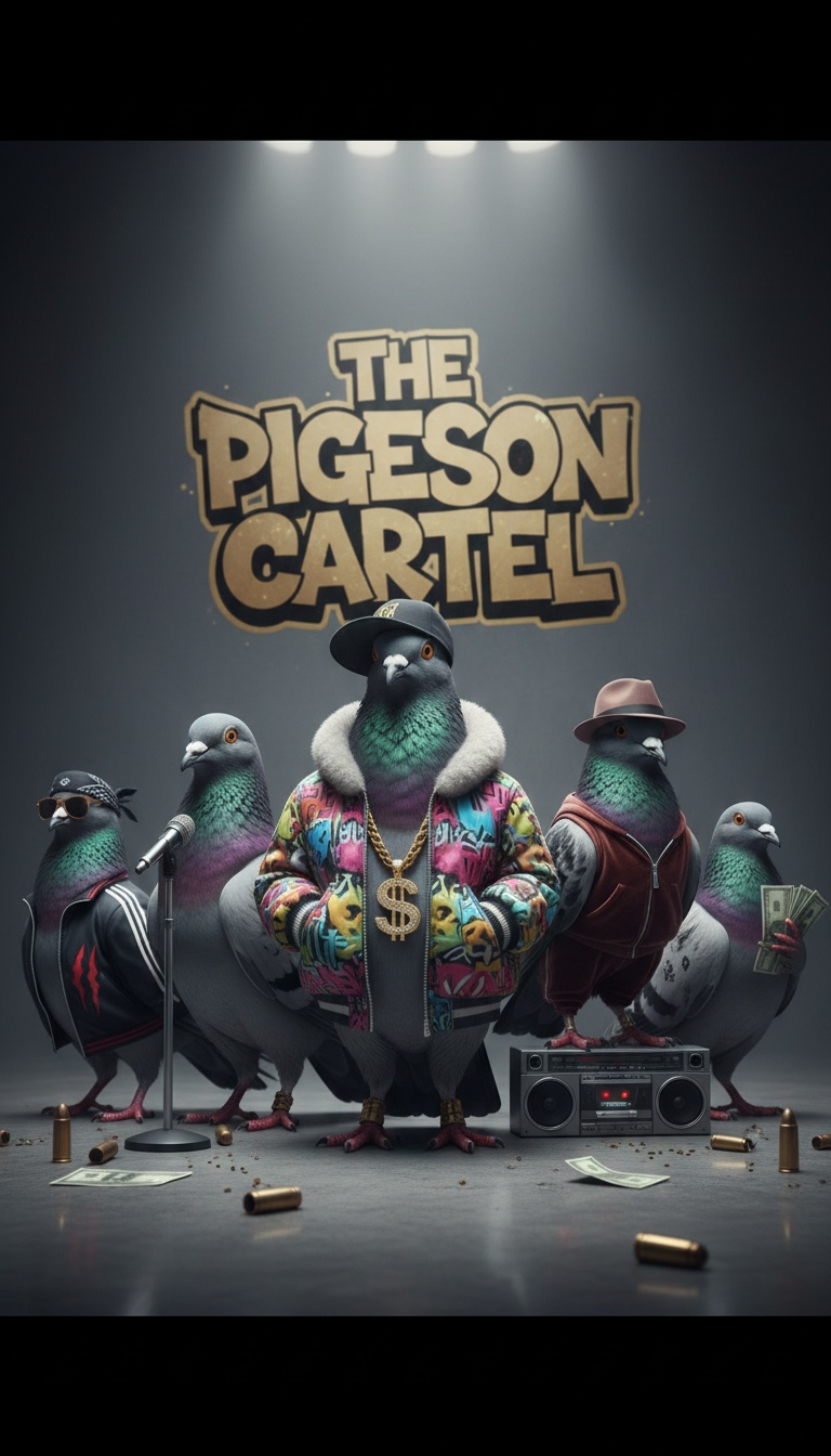 UK Grime with raw, stripped-back urban production, Mid-tempo beat (125–135 BPM) with gritty sub-bass, dry kicks, sharp snares, and minimal melodic elements, Cold city atmosphere, concrete reverb, subtle fluttering or percussive textures, Vocal delivery mimics pigeon behaviour: repetitive phrasing, stuttered rhythms, short looping motifs, nervous pauses, sudden bursts followed by silence, Call-and-response lines, echoed words, doubled syllables, circular thoughts, Semi-monotone but emotionally tense, anxious survival energy, UK accent, street-level realism, Lyrics feel fragmented, observational, instinct-driven, Mood is urban endurance, hunger, vigilance, persistence, Pigeon POV: crumbs, crowds, feet, threats, repetition of days, Dead-serious tone, hypnotic and unsettling rather than comedic, Clean but raw mix