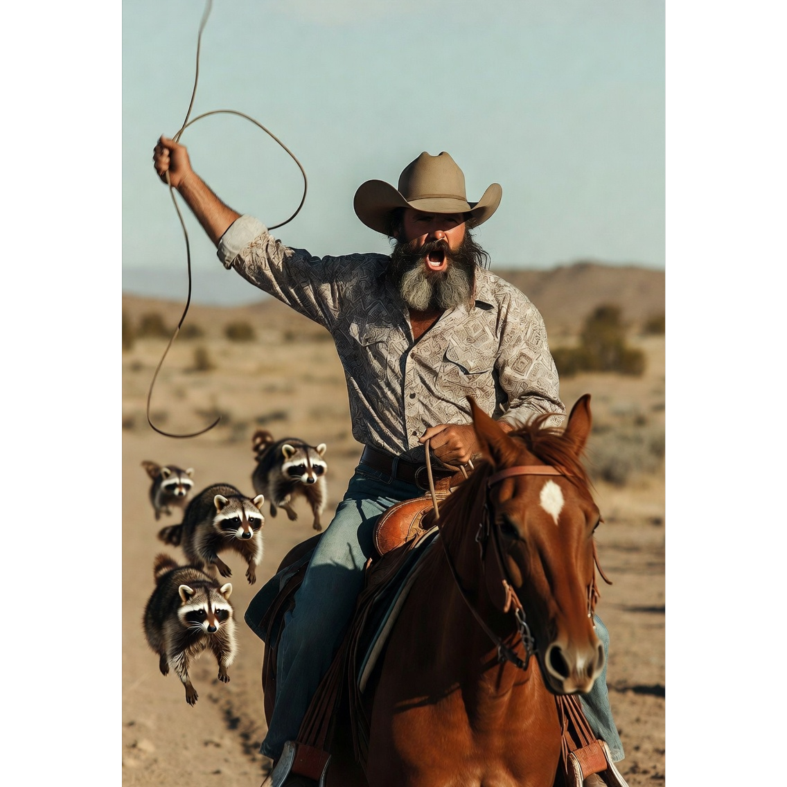 A loose and rowdy Western Rock track built on a dusty frontier groove, twangy electric guitars, and a stomping cowboy backbeat, The rhythm swings with that classic Western swagger, but the guitars carry a gritty rock crunch that drives the song forward, The vocals sit between storytelling country grit and barroom rock attitude, easy to chant and easy to shout in a crowd, The mood stays playful and chaotic, Occasional bright, melodic whistles cut through the mix as a signature hook, acting like a call signal for the raccoons that follow Whistle Boy, The whole sound feels like a campfire tale told too loud, with energy closer to a saloon band tearing up the stage than a calm Western ballad