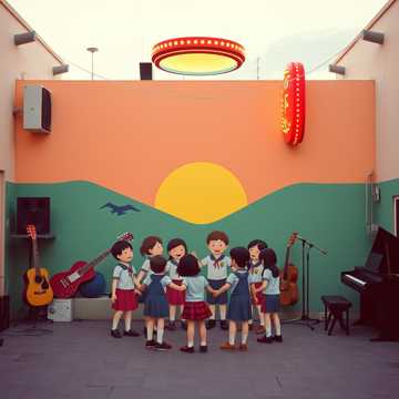 Crooner vocals of 11 Year Old Boys and Girls Sing in unison About Their friendship Experience And Group That Sticks Together, Crooner Boys and Girl Voices, Uplifting, Tight Guitar And Piano Melodic Harmonies With Esquisite Sport Pumping Rhythm, Groovy And Catchy, Hit Tune!, Beat, Drum And Bass, Cowbell, Indie Style