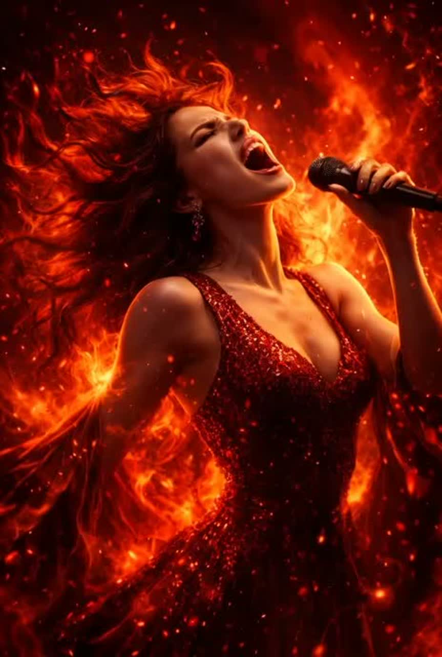 A woman sings like open flame — dangerous, luminous, impossible to hold, Her world glows red: the color of desire striking like a match, the heat before a kiss, the burn that makes you feel alive, Every line flickers between devotion and destruction, Tone: