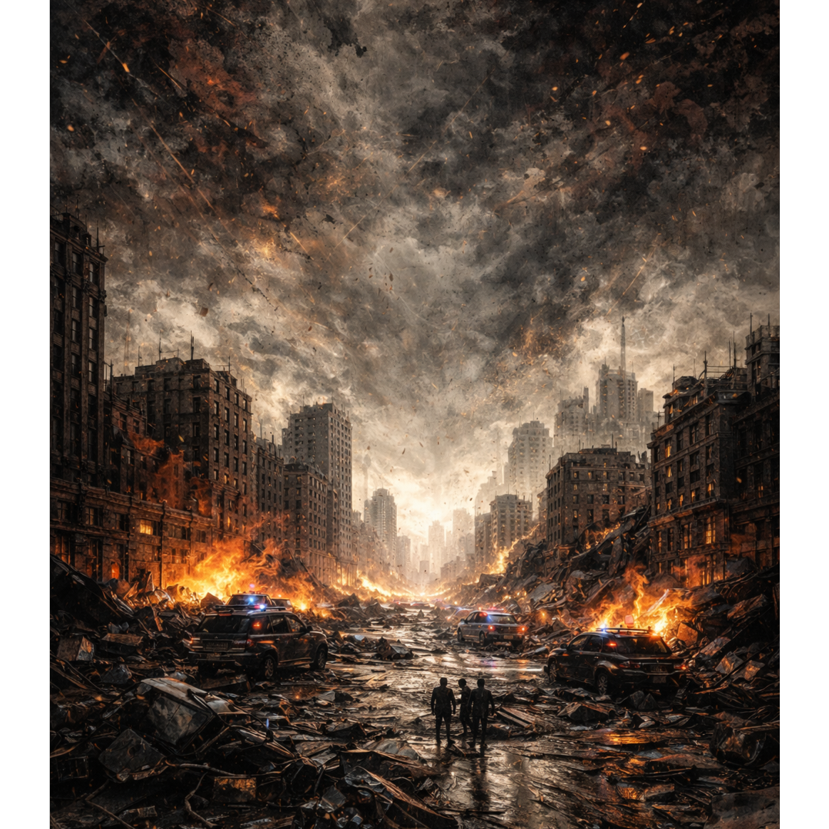 Sparse industrial hip-hop fused with dark minimalist trip-hop, Minimal, heavy drums with cold metallic percussion and long gaps of silence, Subdued, murky bass and shadowy atmosphere focused on tension rather than groove, Mood is watchful, paranoid, and restrained, like a city under quiet surveillance after a catastrophe, Delivery should feel controlled, deliberate, and emotionally distant, never aggressive, Dusty analog texture throughout, as if replayed from a worn record or archival tape