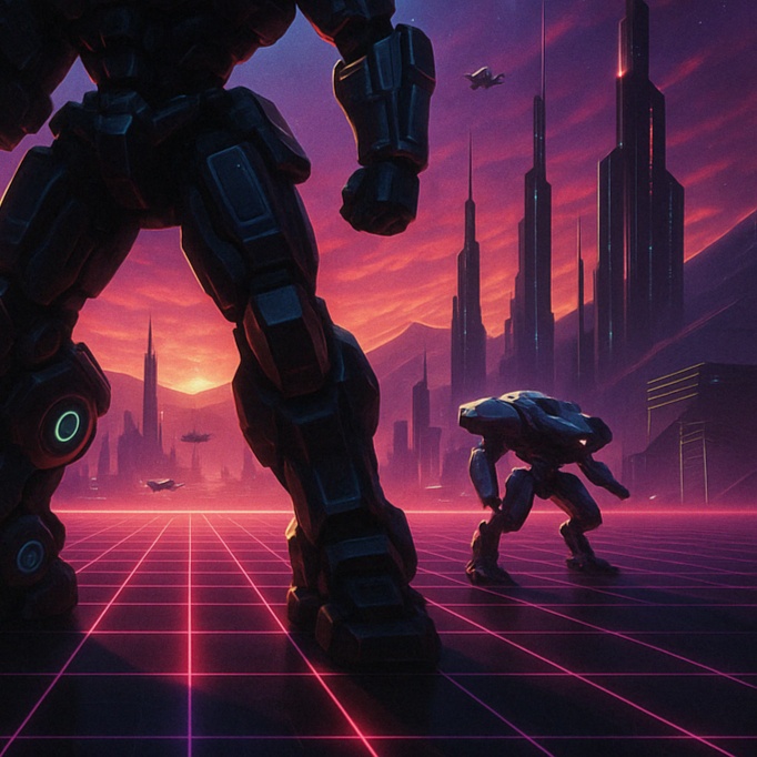 Synthwave/Darksynth, retro-futuristic beats, ethereal vocals