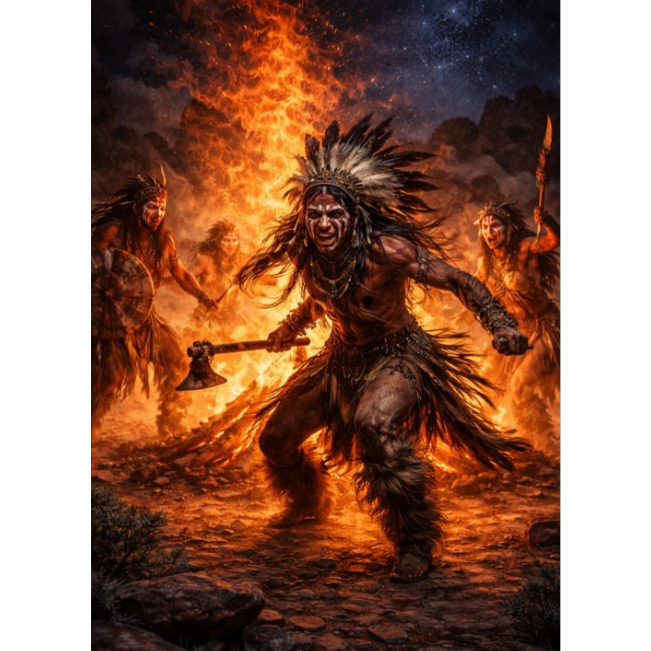 epic powwow–metal fusion track, war chant, gang chanting, Include stomp-clap powwow drums, rattles, hand drums, distorted guitars, and heavy bass, tribal heavy metall fusion song with tribal rhythmic drum, distorted guitars and pounding drums, male vocals, epic, cinematic dynamics, raw and powerful
