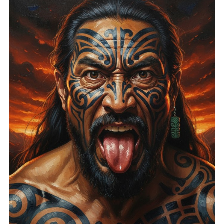 Māori heavy metal, tribal drums, haka shouts, Māori haka, chanting, traditional rhythms, taonga pūoro, Heavy metal fused with Māori haka chanting, aggressive electric guitars, pounding double-kick drums, traditional pahu drum rhythms, warrior-like chanting, raw and intense energy, epic battle atmosphere, tribal percussion interwoven with metal riffs, cinematic and powerful