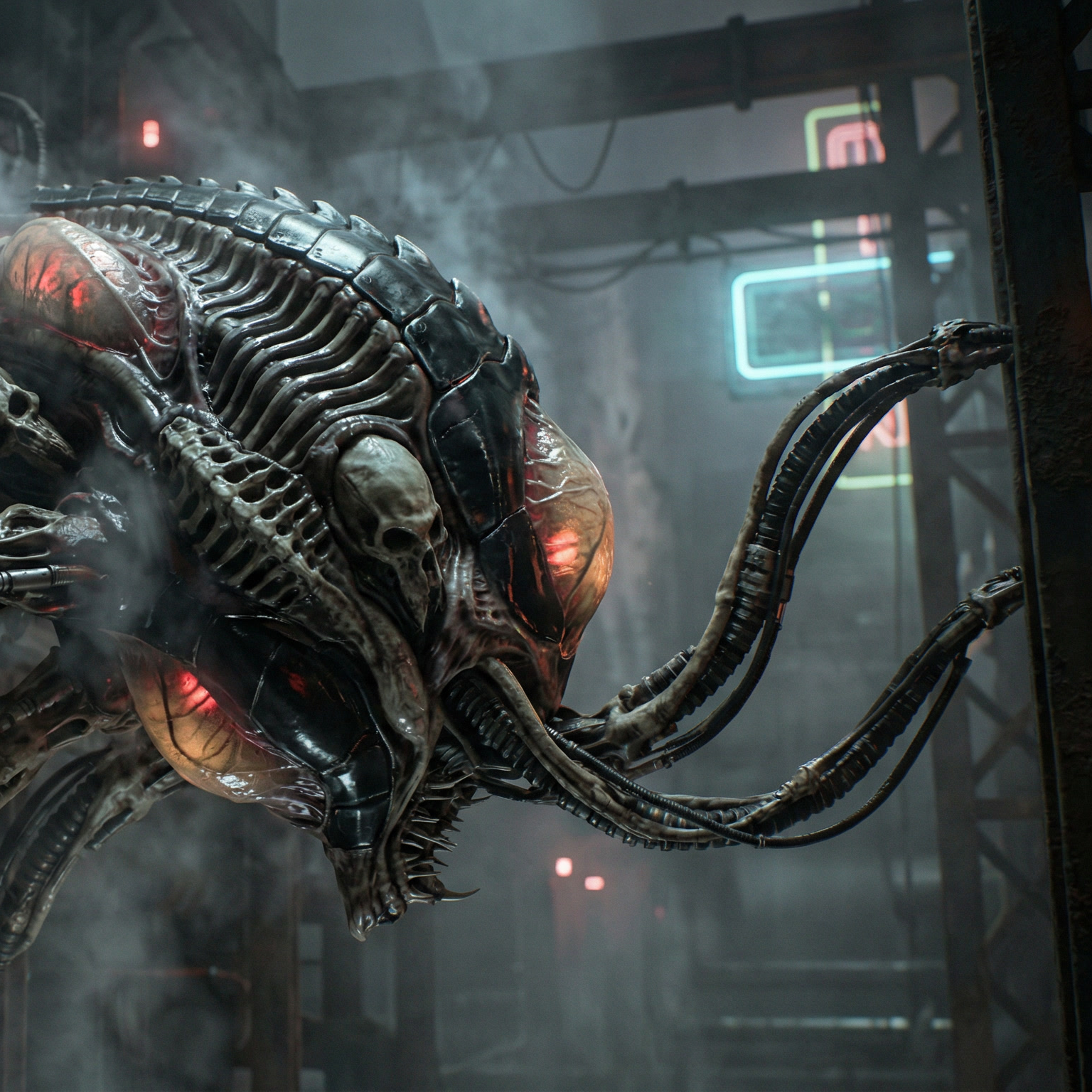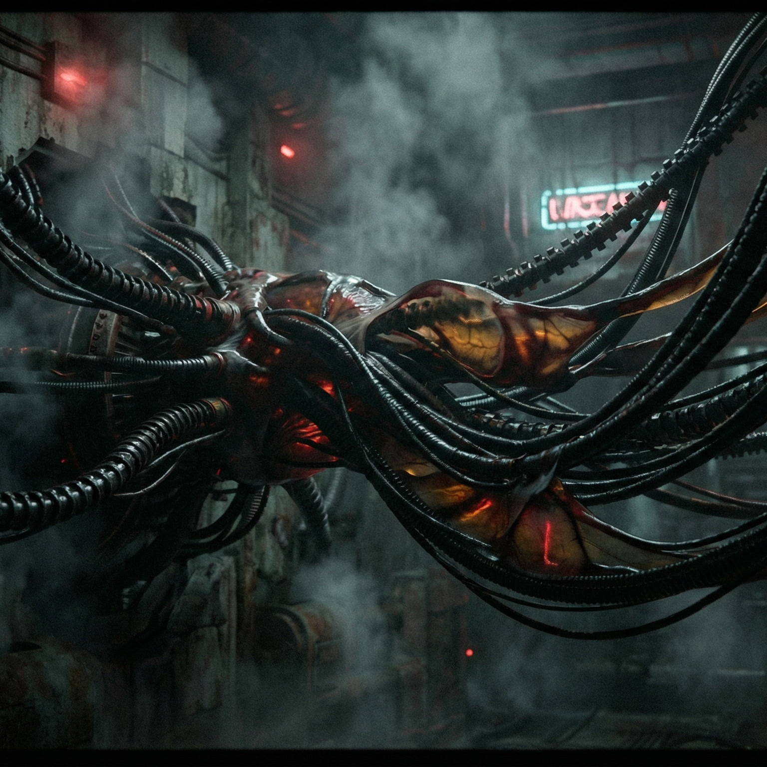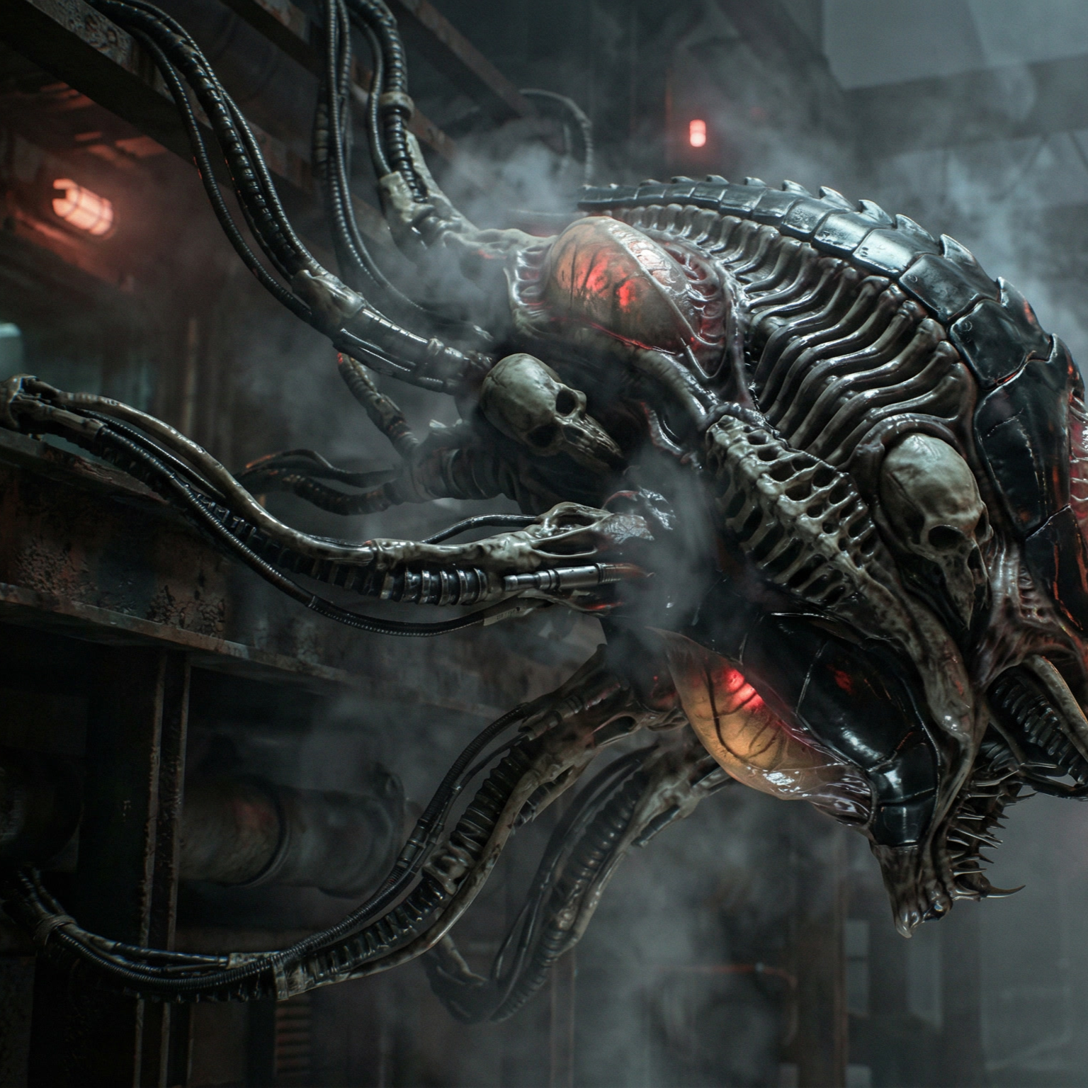 dark ambient industrial, deep drones, metallic textures, slow evolution, oppressive atmosphere, biomechanical sci-fi horror, no melody, industrial, slow, deep, dark ambient
