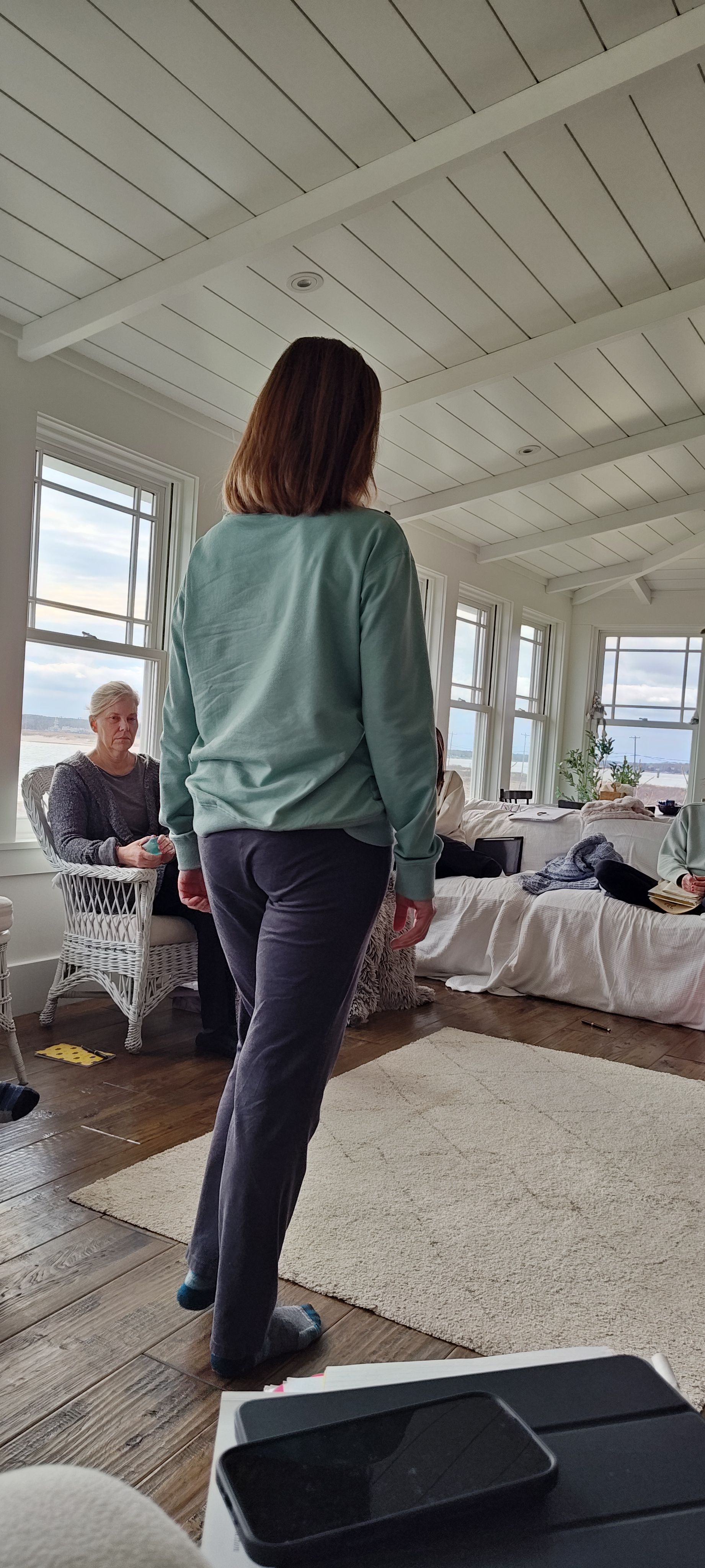 Cinematic somatic ambient with minimalist piano, warm strings, and natural environmental textures (Cape Cod ocean waves, wind, wood creaks, distant birds), Tempo ~68–72 BPM with elastic timing—phrases stretch like breath, No heavy percussion, Vocal style: intimate, grounded, slightly reverent—female/male duet with occasional soft spoken-word passages, Include subtle group vocal layers to evoke workshop presence, Theme: A 5-day AT intensive in East Sandwich, Cape Cod (Nye Road and Route 6A), Include imagery of a farmhouse, cottage, and a renovated barn where chair work took place and deep somatic change occurred, * Learning and embodying the 10 AT Interweaves