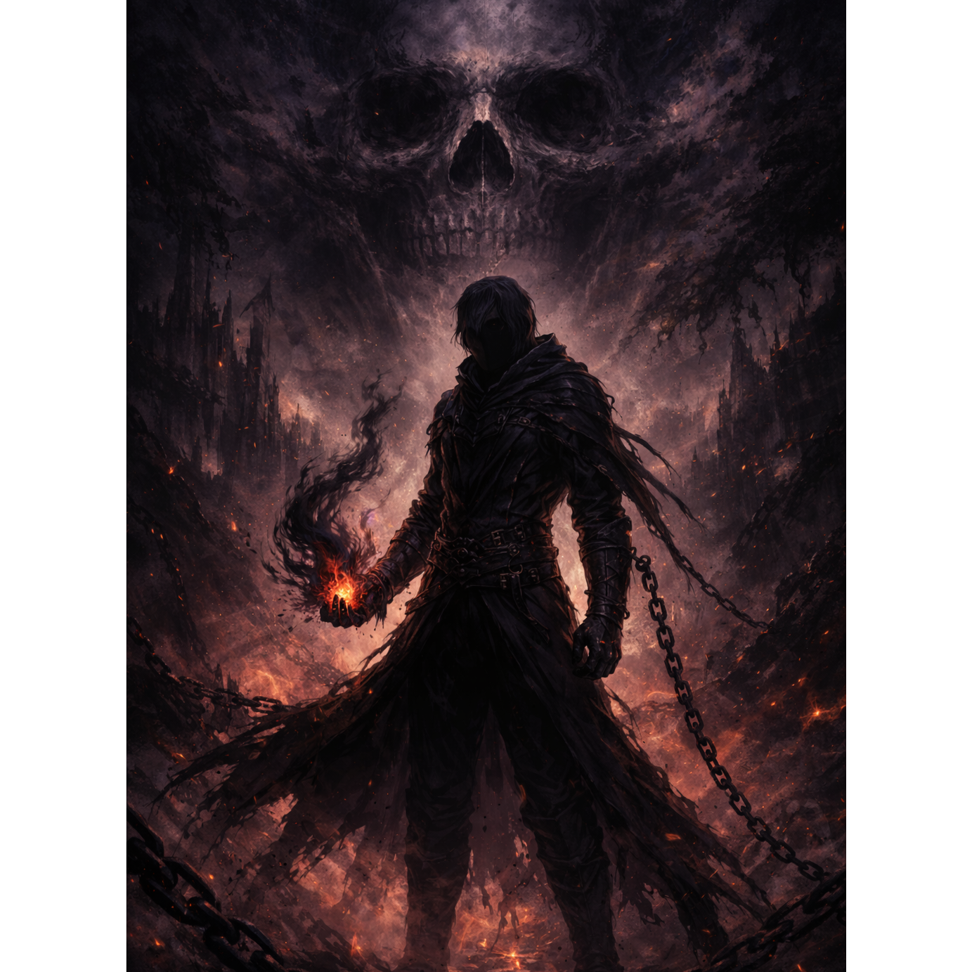 Toon: Dark fantasy cinematic, tempo: 82 BPM, key: minor, Mood: quiet tension, controlled judgment, human warmth beneath restraint, No heroism, no triumph, Setting: interior night, burning mansion, confined space, smoke and shadow, Vocals: