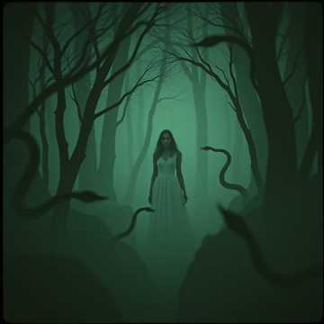 Theatrical folk-horror metal that transitions through contrasting emotional landscapes, Opens with fairytale-like acoustic passages featuring crystalline clean vocals in storytelling mode, gradually building tension, The happy section explodes into upbeat power metal with folksy melodies and singalong qualities, maintaining theatrical vocal delivery with dramatic pitch variations, The dark transition employs sudden tempo shifts and menacing palm-muted riffs, with vocals descending into lower, more sinister registers, Layered backing vocals create haunting harmonies during the ominous conclusion, while maintaining the progressive song structure throughout