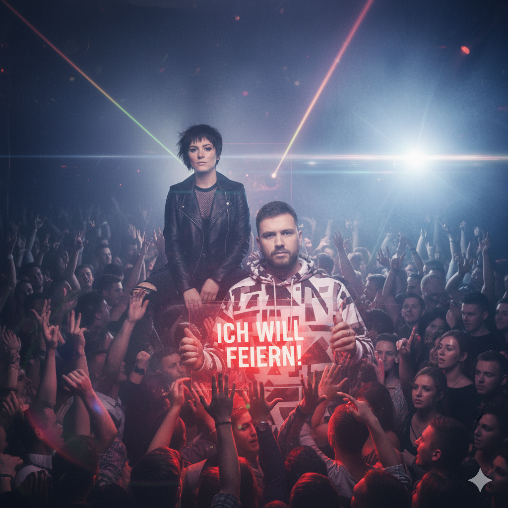 [Industrial Techno, 150 BPM, dark ritualistic vibe, no melody, no chords, no reverb, Distorted mono kick, pulsing sub-bass, metallic percussion (chains, steel hits, clanks), transformer buzz, steam hiss, granular sweeps, – rhythmic, not melodic, no singing, no autotune, Vocals dry, mid-forward, lightly compressed, with subtle grit; phrases end abruptly or echo into glitched fragments, Structure: 8-bar intro (FX + sub only), then full beat, Verses: punchy, narrative flow; each line accented by industrial FX (e, g, steam burst on “neun”, metal clang on “dran”), Chorus: anthemic but mechanical – Inspired by Baga Tek and factory liturgy, Female vocals absent, Outro: vocals degrade into noise, fade to transformer hum, Sampling rate: 48 kHz]