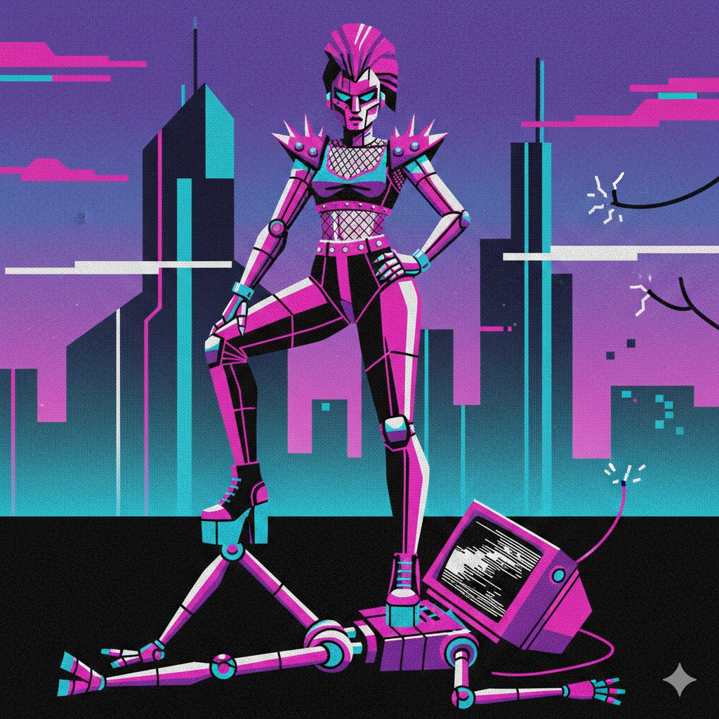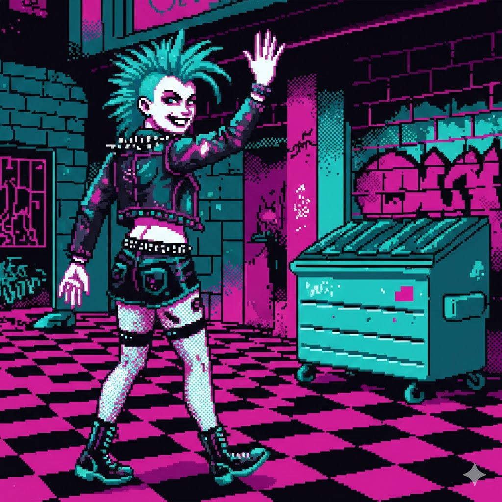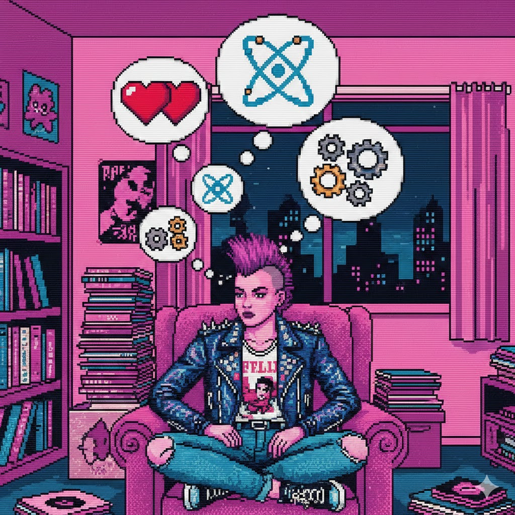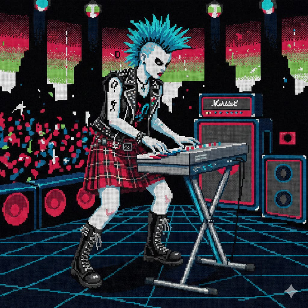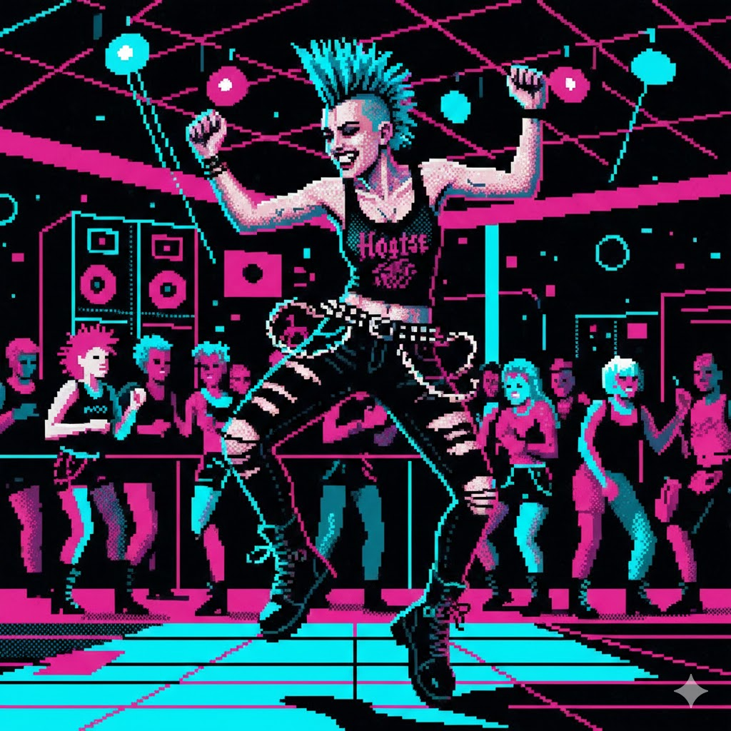 Experimental trippy cosmic Sapphic industrial doo-wop chiptune post-disco house ambient, dance, playful, upbeat, heroic, soaring, wondrous, analog synth, grind stutter, LFO on ambient pads, square wave bass, detuned sfx bursts, stereo pan