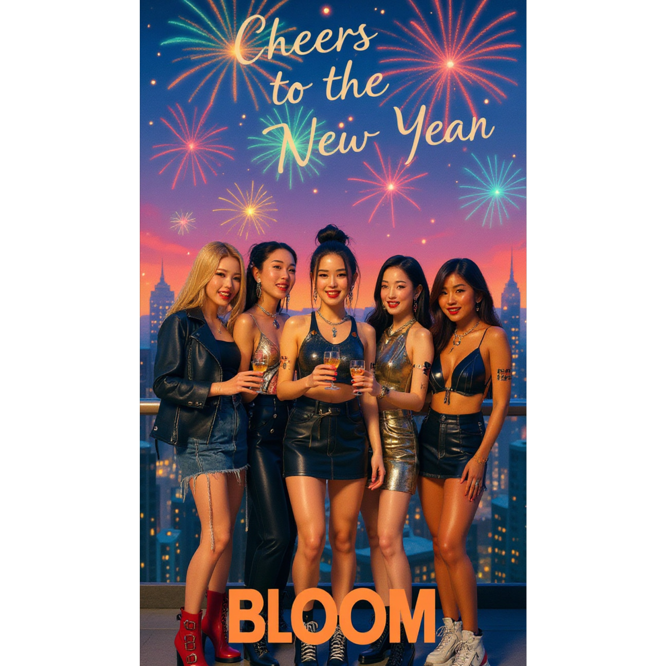 K-Pop, Future R&B, Hyperpop, Electronic Pop, 70s Disco, Funky, Orchestra, House, New Year celebration, party anthem, 5-member female group vocals, experimental production, vocal chops, reverse effects