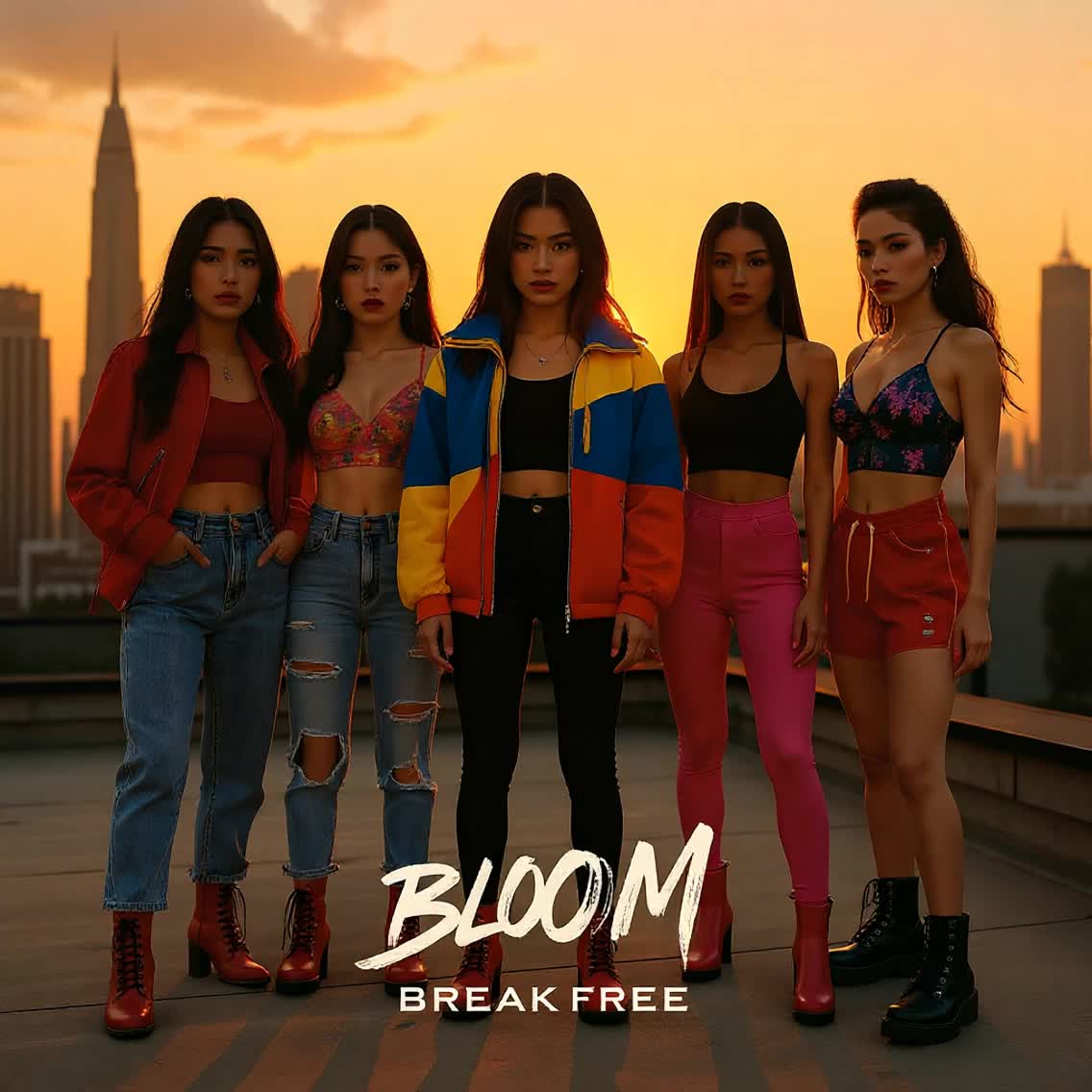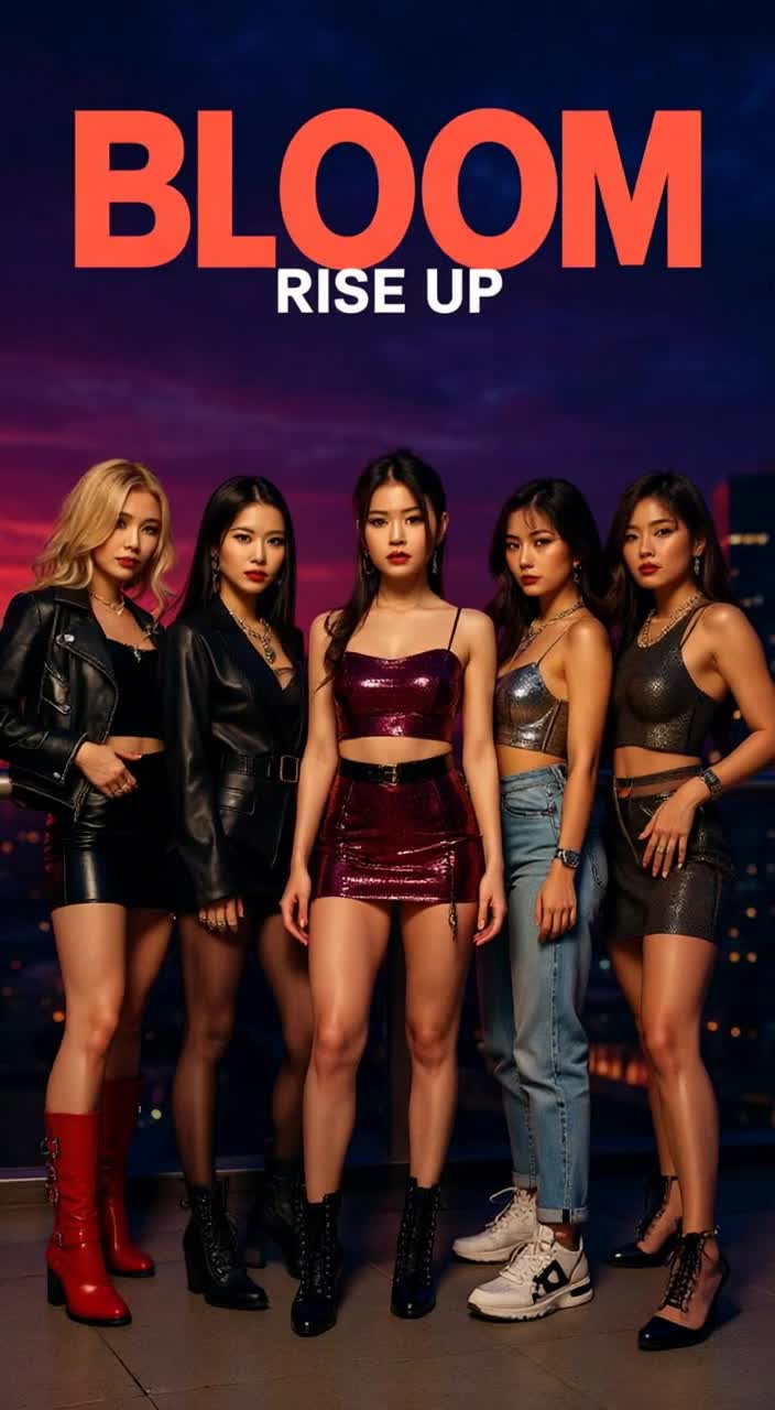 K-Pop, Future R&B, Hyperpop, Trap, Electronic Pop, Dance Pop, Korean Pop, 130 BPM, E minor, K-Pop group of 5 female vocals with joyful energy each with very distinctive individual style and unique sound, passionate, soaring, Dramatic Voice, Coloratura Soprano Voice, Emotional, 808 bass, trap snares, aggressive synths, electric guitar riffs, orchestral hits, vocal chops, electronic flourishes, stadium percussion, K-Pop sophistication with explosive drops, vocal layering, stereo panning, heavy bass, dynamic builds, genre switches, festival-ready mix, explosive confidence, unstoppable energy, empowerment, rebellious spirit, K-Pop supremacy, electrifying celebration