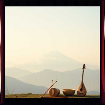 Ambient fusion with Japanese gagaku instruments (sho, hichiriki, koto), Floating and meditative soundscape, modern minimalism style