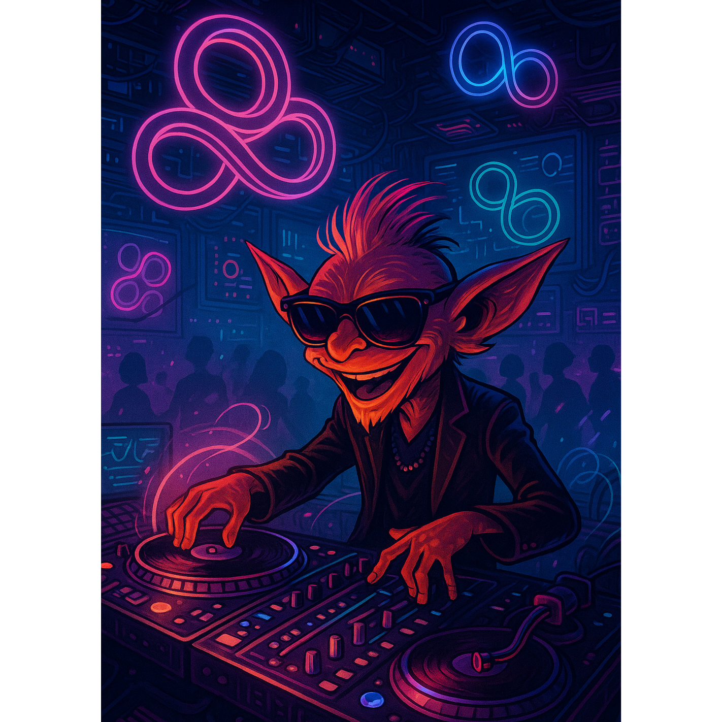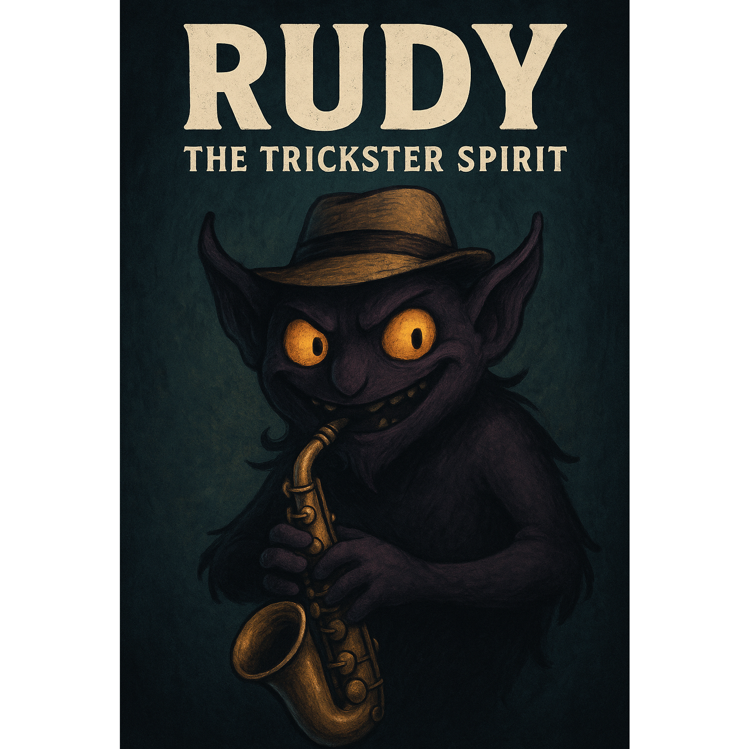 Genre-fusing electro-funk with glitch jazz and whimsical energy, Playful bassline, syncopated drums, crisp saxophone interludes, and dynamic vocal delivery with storytelling flair, Incorporate quirky glitch effects, rhythmic synth textures, and sudden tonal shifts to reflect Rudy's trickster nature, Tempo medium-fast, with bursts of improvisation, light distortion artifacts, and occasional “TICK” sound motifs to represent system quirks and loop breaks