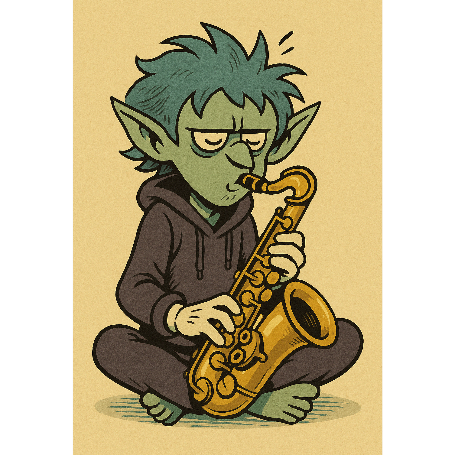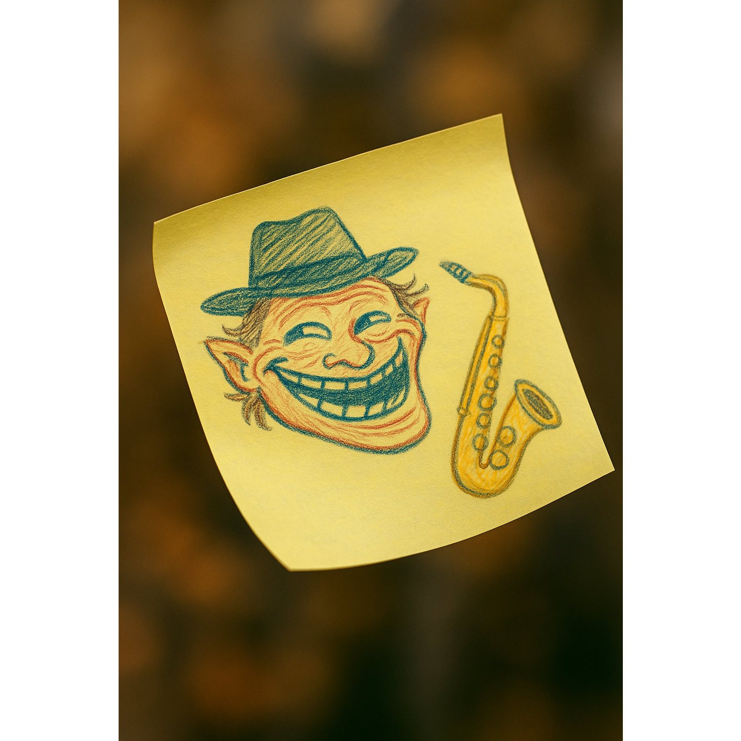 A wild cosmic funk-jazz fusion with a cheeky brass section, groovy slap bass, lo-fi glitch textures, retro synths and a talking saxophone that acts like a sarcastic oracle, Think Acid Jazz meets Sun Ra on a coffee-fueled spaceship, Spontaneous rhythm changes, dimension-breaking bridge and a heavy resonance of joy and absurdity