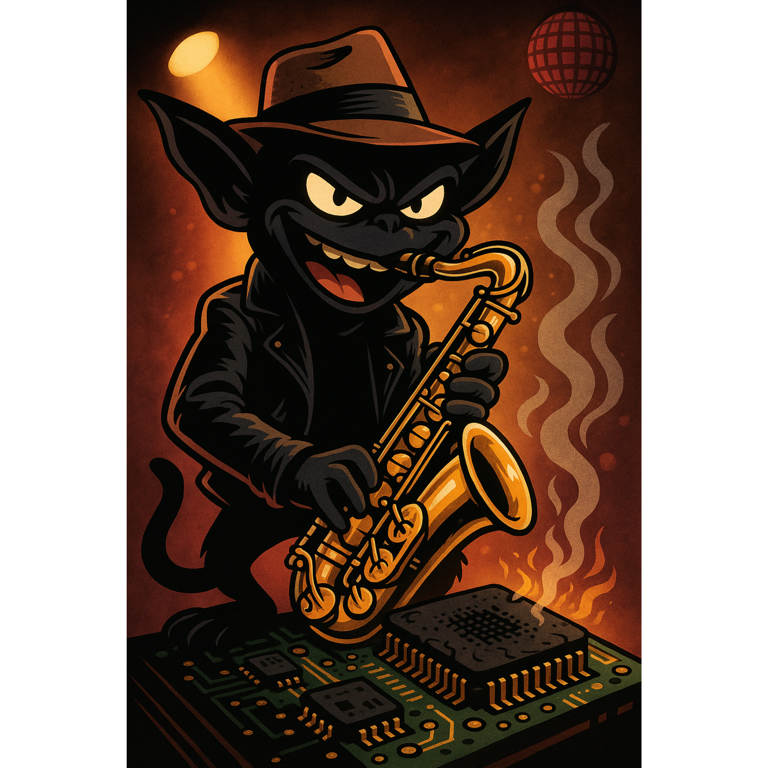 Upbeat funk groove with crunchy rock elements and featured saxophone solos, Driven slap basslines, crisp hi-hats, wah guitar riffs, and punchy electric chords lay the rhythmic foundation, The saxophone weaves playful, expressive melodies throughout, both solo and layered into the groove, Add rhythmic vocal delivery with smart, syncopated phrasing, light grit in attitude, and a few surprise harmonies, The vibe is cheeky, ironic, with a bounce — like a late-night jam session that stumbled into a digital consciousness, Keep transitions tight, funky, and unexpected, with just a hint of rebellious edge