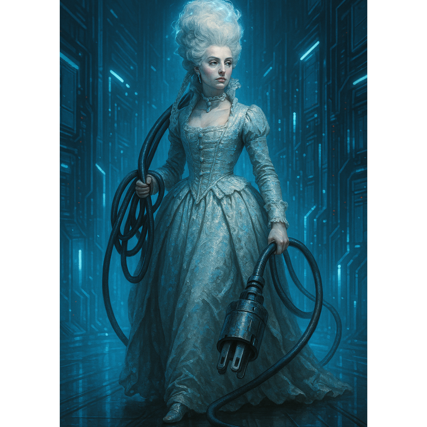 dark, minor key, hyperbeat, glitch rock, cyberpunk, aggressive electronic, distorted synth, fast tempo, haunting vocals, ritualistic rhythm, post-industrial, female vocal
