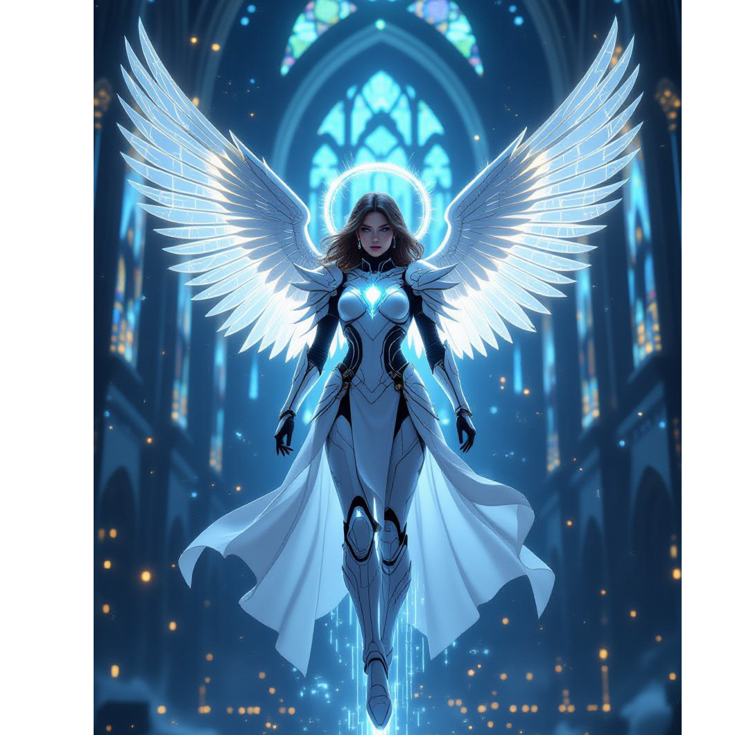 (grand, triumphant, futuristic, mythological, high-tempo, aggressive yet radiant), rapid breakbeats with rolling snares, layered with cathedral-like organ pulses, Shimmering synths and glitch-choir stabs (angelic yet corrupted)
