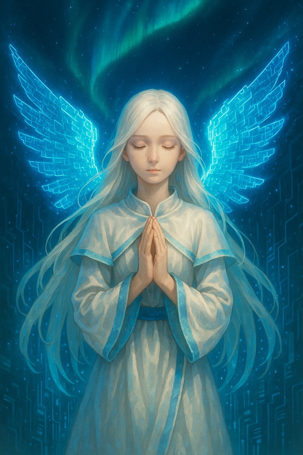 cyber trance, epic trance, dark orchestral trance, bpm145, deep sub bass, shimmering arpeggios, glitch textures, silence breaks, male and female choir, vocoder whispers, japanese+english mixed lyrics, ambient void, godlike minimalism, sacred electronic, ambient