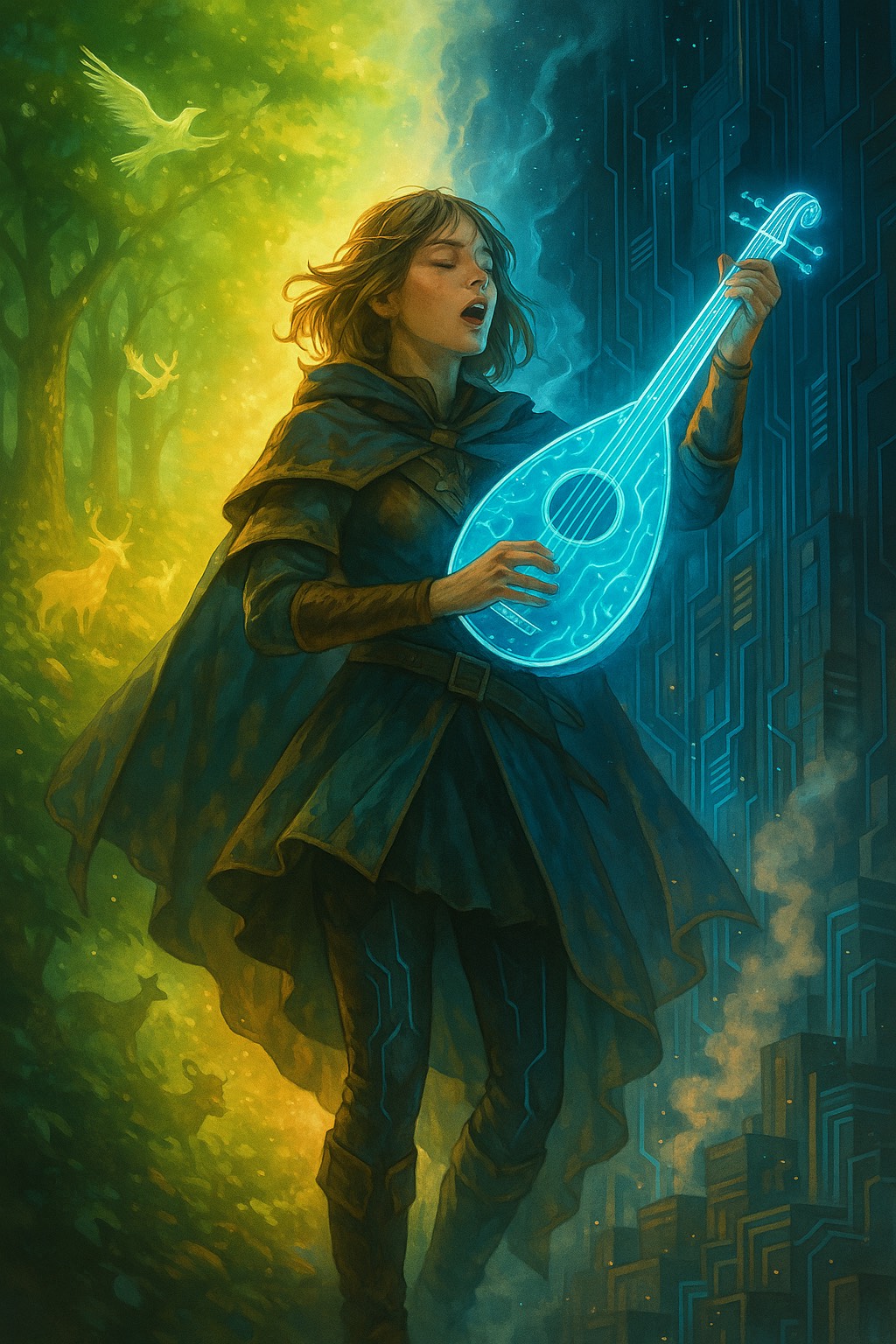 Create a cyber-fantasy rhythm game track using the provided lyrics, Style: A fusion of acoustic bardic elements and modern EDM/trance energy, Start with organic textures (violin, lute-like plucks, harp) then evolve into pulsing trance beats with soaring synth leads, shimmering arpeggios, and expansive pads, Blend acoustic warmth with radiant electronic soundscapes, Overall mood: luminous, emotional, and uplifting, perfect for a [Good] route rhythm game, Vocals: Ethereal female voice, airy and slightly raspy, fragile yet emotional, In later sections, the voice strains with desperation, pushing against the dense trance sound, beautiful Create a 3-minute cybe
