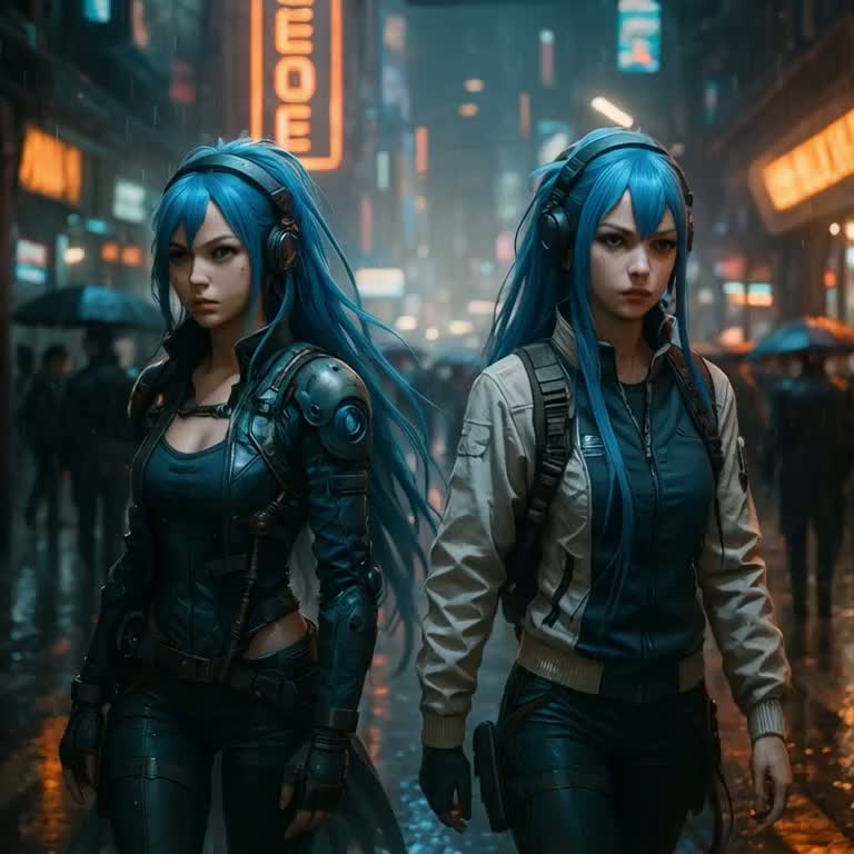 Cyberpunk city night, neon-soaked rainy streets, glitchy digital signs, young rebellious character rapping, short hair, cybernetic eye, optical camouflage, dynamic pose, holding jack cable or small drone, Dark IDM jungle-inspired abstract holographic lights, chaotic rhythm elements, cinematic high-contrast lighting, moody atmosphere, cool neon colors (blue, purple), metallic holographic reflections, urban decay, close-up, expressive facial features, motion of rapping, rain particles with glitch effects