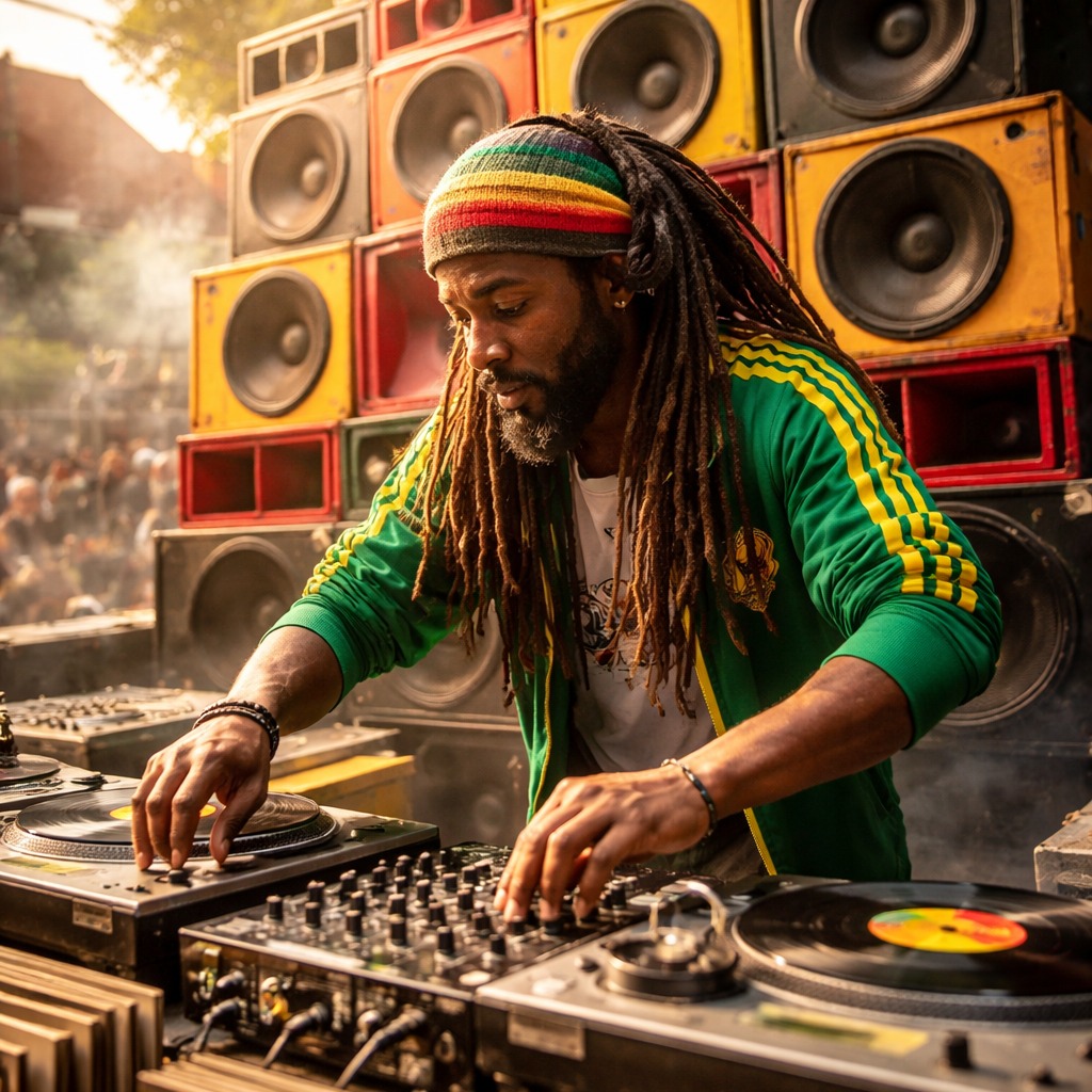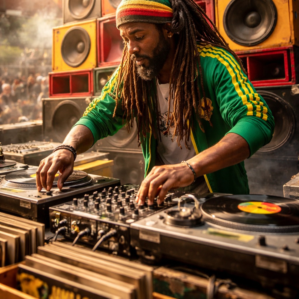 reggae ska caribeno estilo sound system dj tempo medio 85 95 bpm groove relajado pero bailable base con bajo profundo dub Reggae, Ska, Rock, Pop Rock de guitarra offbeat riddim clasico reggae con influencia ska uso de tornamesa con scratch dj loops repetitivos efectos dub como delay reverb eco y filtros intro instrumental con vinilo y ambiente de sound system en vivo drops con cortes de scratch y vocal chops