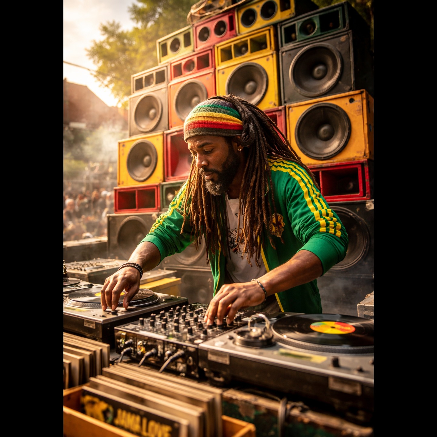 Reggae Sound System DJ track, no traditional instruments, only DJ elements: heavy bass, vinyl scratch, loop-based riddim, dub FX, delay, reverb, echo, Style mix of reggae, dancehall, raggamuffin, reggae rap and hip hop, Energetic, positive vibe, club and street atmosphere, Jamaican sound system style, Include DJ transitions, rewind effects, bass drops, vocal chops, and crowd hype energy, Deep sub bass, rhythmic loops, scratch solos, dub echo trails, No guitars, no drums kit, only electronic DJ sound system elements