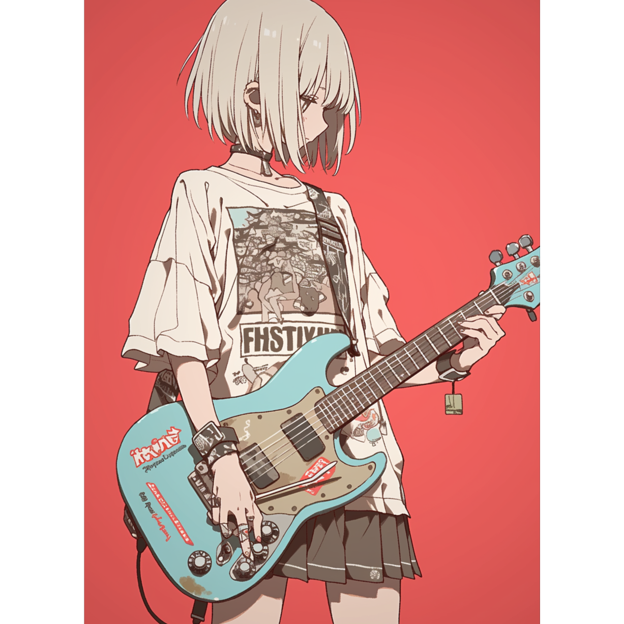 Create a Japanese funky rock song with heavy slap guitar and slap bass, Tempo: fast and groovy around 120–130 BPM, Instrumentation: sharp slap bass riffs, percussive funk-style electric guitar with heavy slap technique, tight funky drums with syncopated hi-hats, occasional brass stabs and handclaps, Mood: playful, high-energy, groovy, fun party-like atmosphere, Imagery: neon city lights, a live club filled with dancing people, colorful spotlight beams, sweat and smiles on stage
