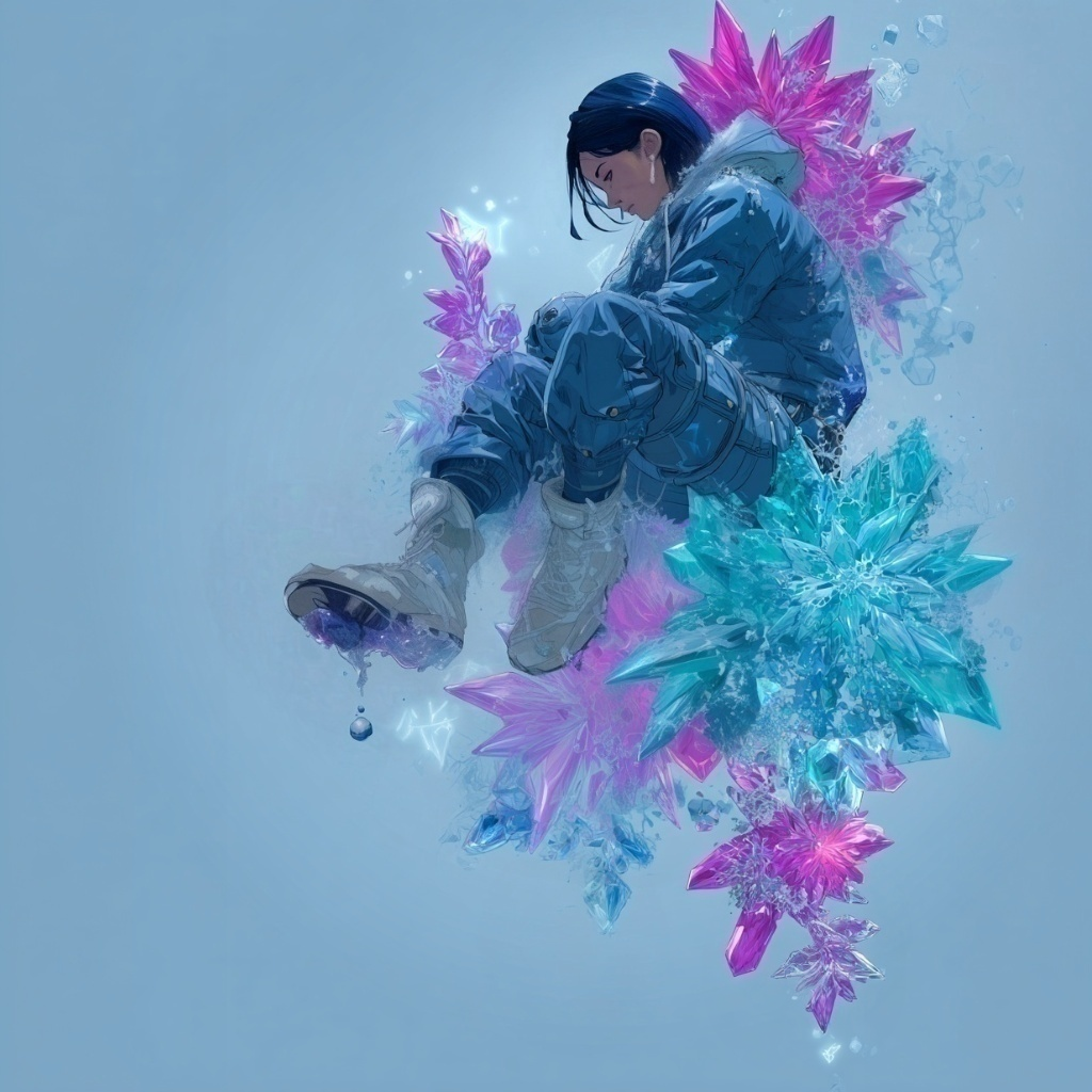 Create a crystalline ambient electronica piece with breathy androgynous whisper vocals that melt into the soundscape like ASMR textures, The emotional core evokes a frozen inner landscape slowly thawing—crystallized emotions dissolving into delicate droplets of release, Begin with glassy synth arpeggios shimmering through deep reverb, layered with ice-crackle and water-drop sound effects, Minimal beats pulse beneath warm sub-bass and drone ambient pads, Mix with ultra-wide stereo field and crystalline clarity, creating floating weightlessness and ephemeral beauty, Chillwave and anime soundtrack influences meet glitch pop elements in quiet liberation, ‑vocaloid, ‑rap
