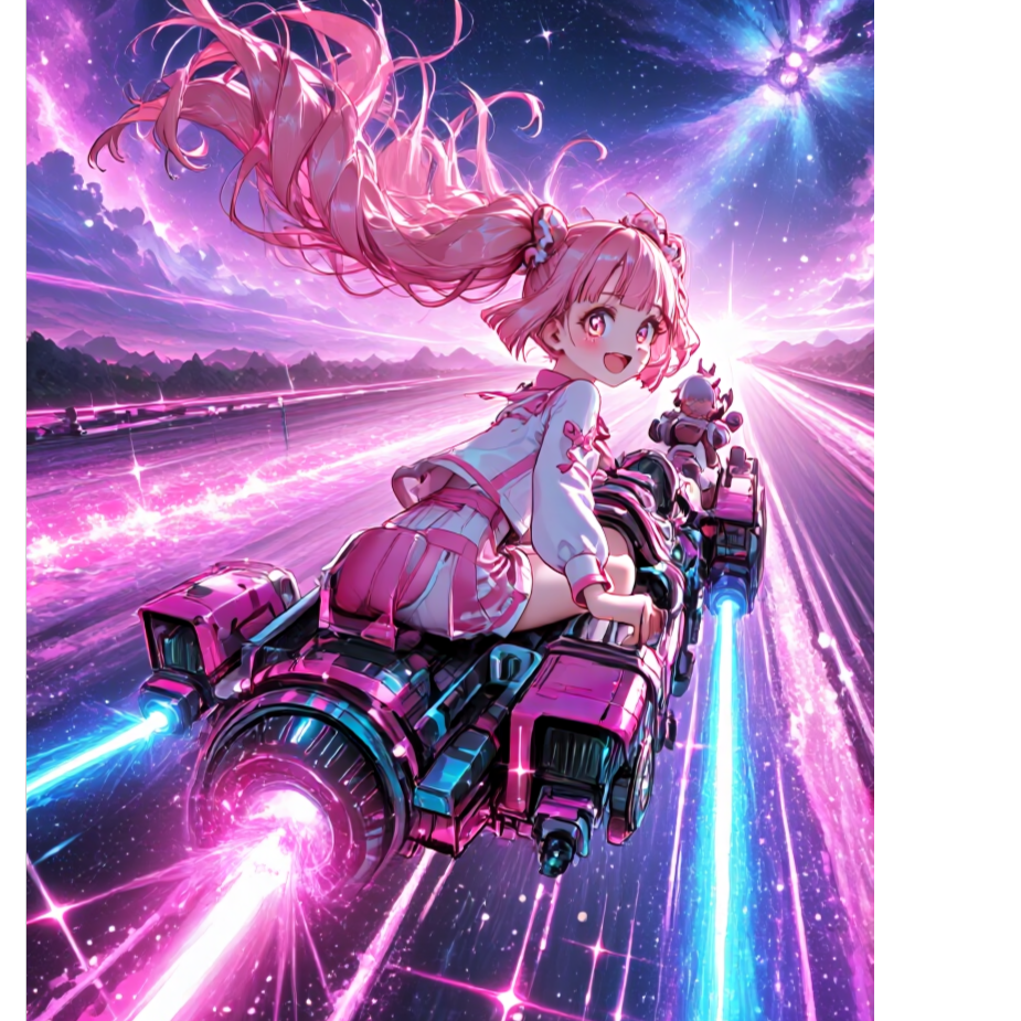 Kawaii Core, japanese-pops, Features driving Eurobeat synth arpeggios, intense distorted synth leads, a punchy hardstyle kick, and hyper-sweet, layered vocal hooks, Core Properties: Fast, driving 4/4 rhythm with an intensely melodic, emotional chorus, High-pitched, super sweet, and energetic female vocals, ~165 BPM, C Major, FX/SFX: Heavy sidechain compression on synths, Glittery synth sweeps, sparkle SFX, spaceship whoosh SFX, Classic Eurobeat "whoosh" transitions and dramatic fills, Pitch-up vocal chops, Theme: Galactic Youth Love — Infinite Love Across the Cosmos, High-Speed Romance, Sugar-Rush Feelings, Zero-Gravity Embrace, Mood: Hyper-energetic, Dreamy, Intensely Sweet, Overwhelmingly Romantic, Mix: Vocals are hyper-processed (autotune, reverb, compression) and sit on top of the mix, Eurobeat synths create a wide, bright wall of sound, Kick and Bass centered and powerful