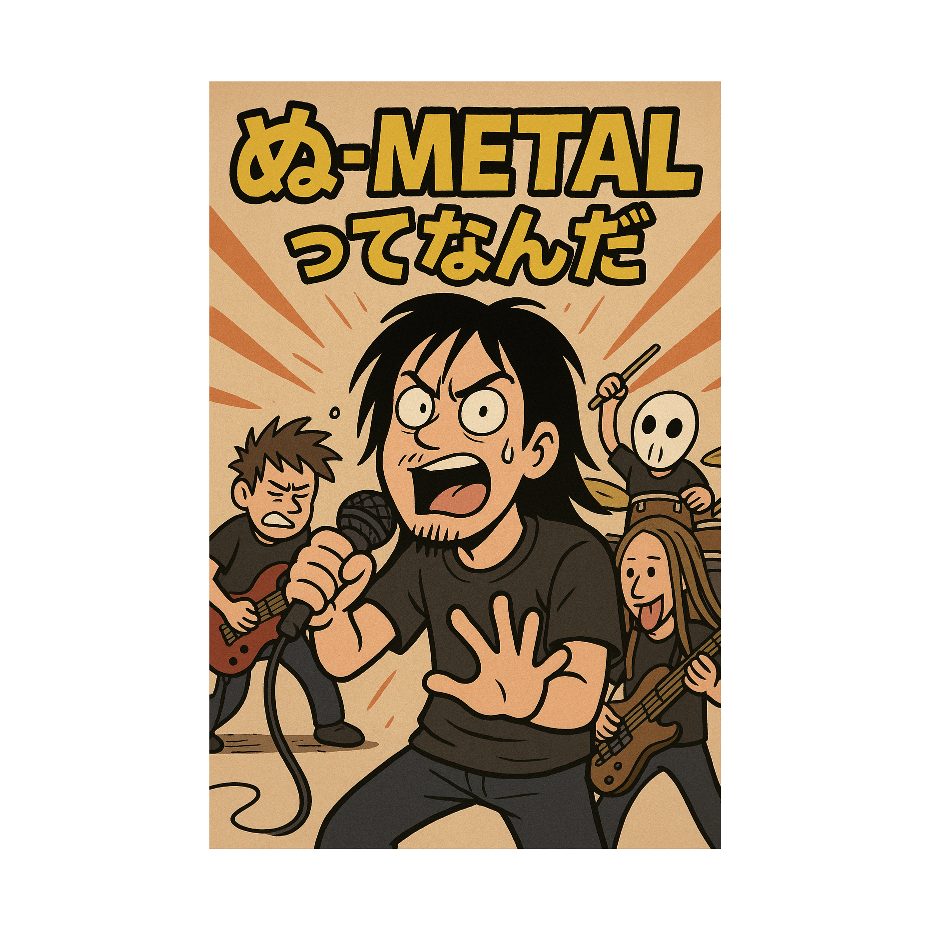 Comedic Rock with heavy riffs, groovy bass, playful vocals, and wordplay, energy, A humorous, energetic heavy Metal song, Powerful distorted guitars, groovy bass, heavy drums, and playful & strong enka vocal delivery, The lyrics question the meaning of “ぬ-Metal”blending wordplay, silliness, and real metal energy, The vocal alternates between shouting, rapping, and melodic chorus, Tempo around from 150 to 170 BPM, strong rhythm groove, live band feeling, Sound is thick, warm, slightly chaotic but catchy