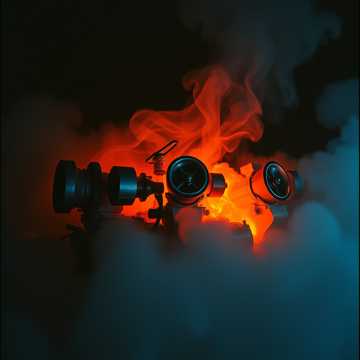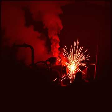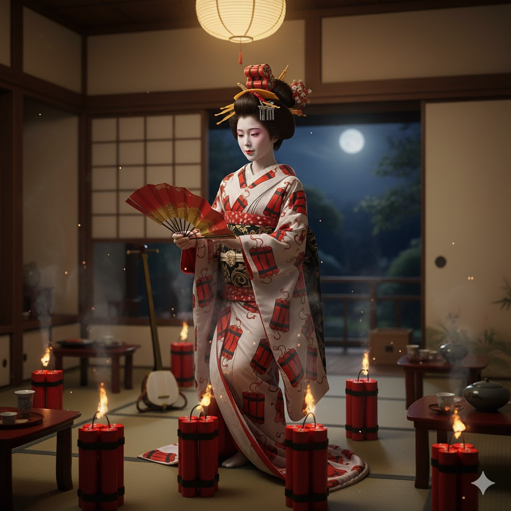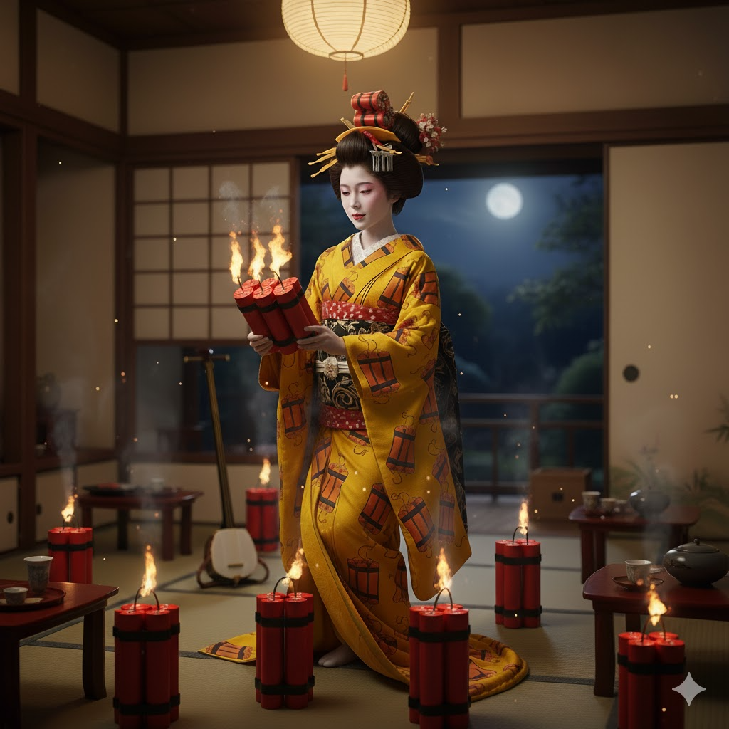 Keywords: Kyoto night, red lights, cherry blossoms, fire, explosion, elegance, passion