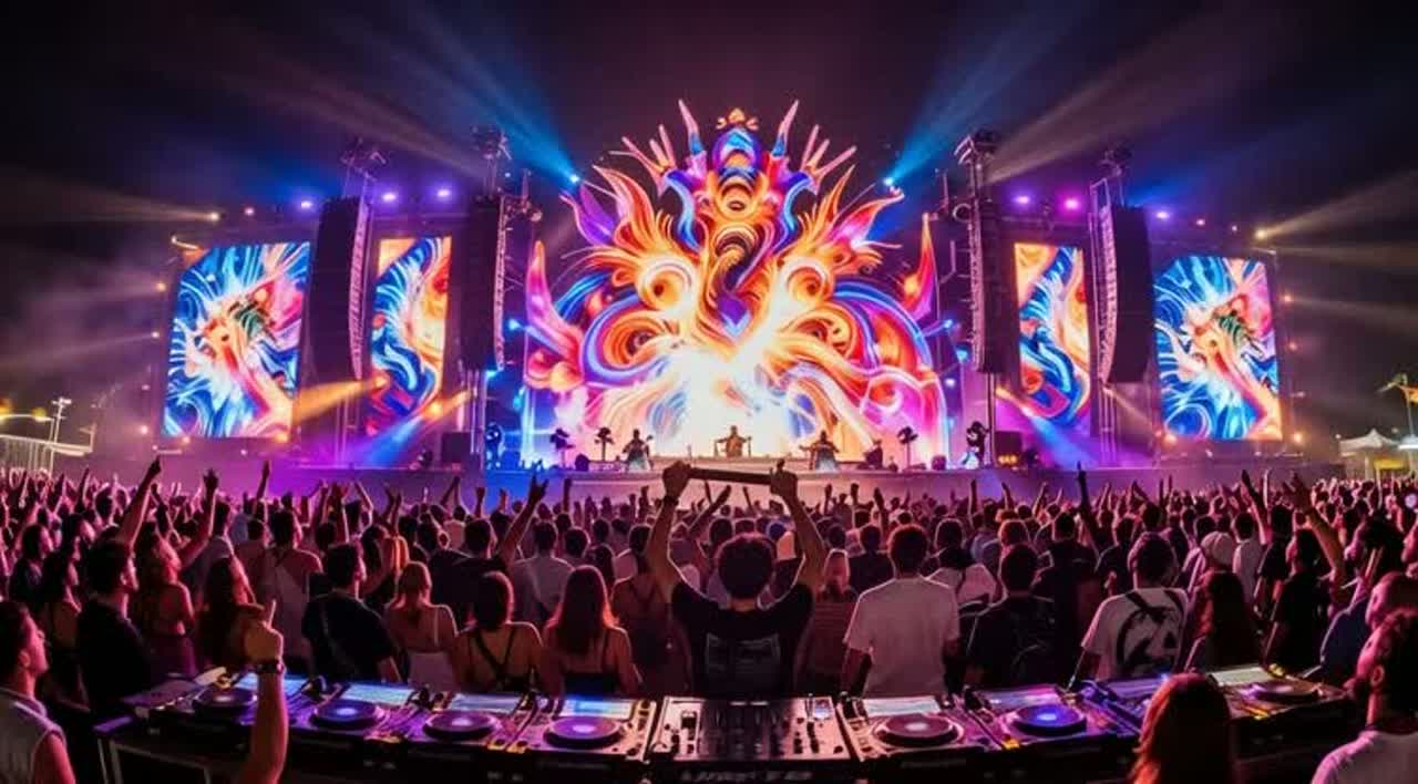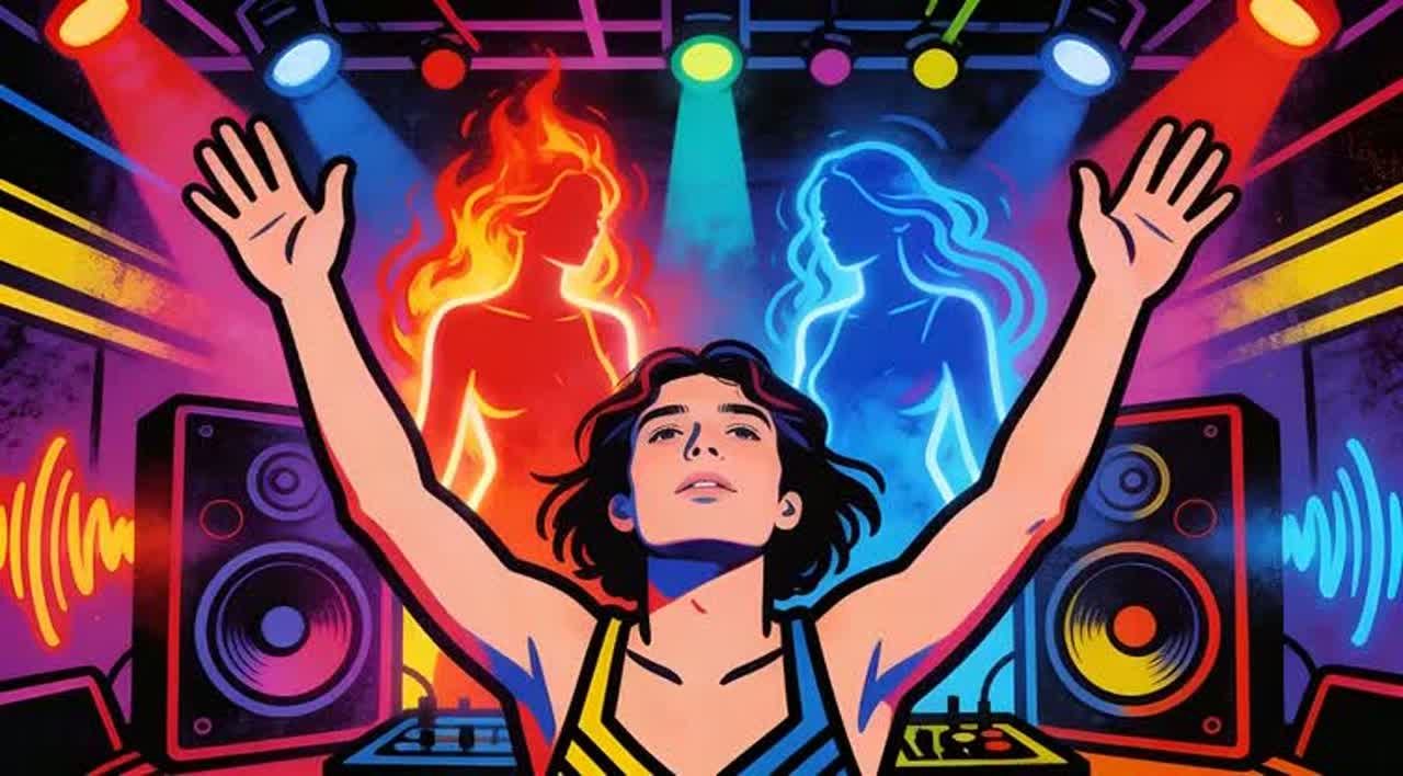 Rave party, high-energy techno / trance, hands up, 140 BPM, Heavy punchy kick, rolling bassline, layered supersaw leads dancing together, rave stabs, tension risers, white noise FX, Festival energy, Male lead vocal with two female supporting tones (warm and raw), Call and response hooks, chants, whispers, echoes, Modern uplifting rave sound, emotional but powerful, no crowd noise