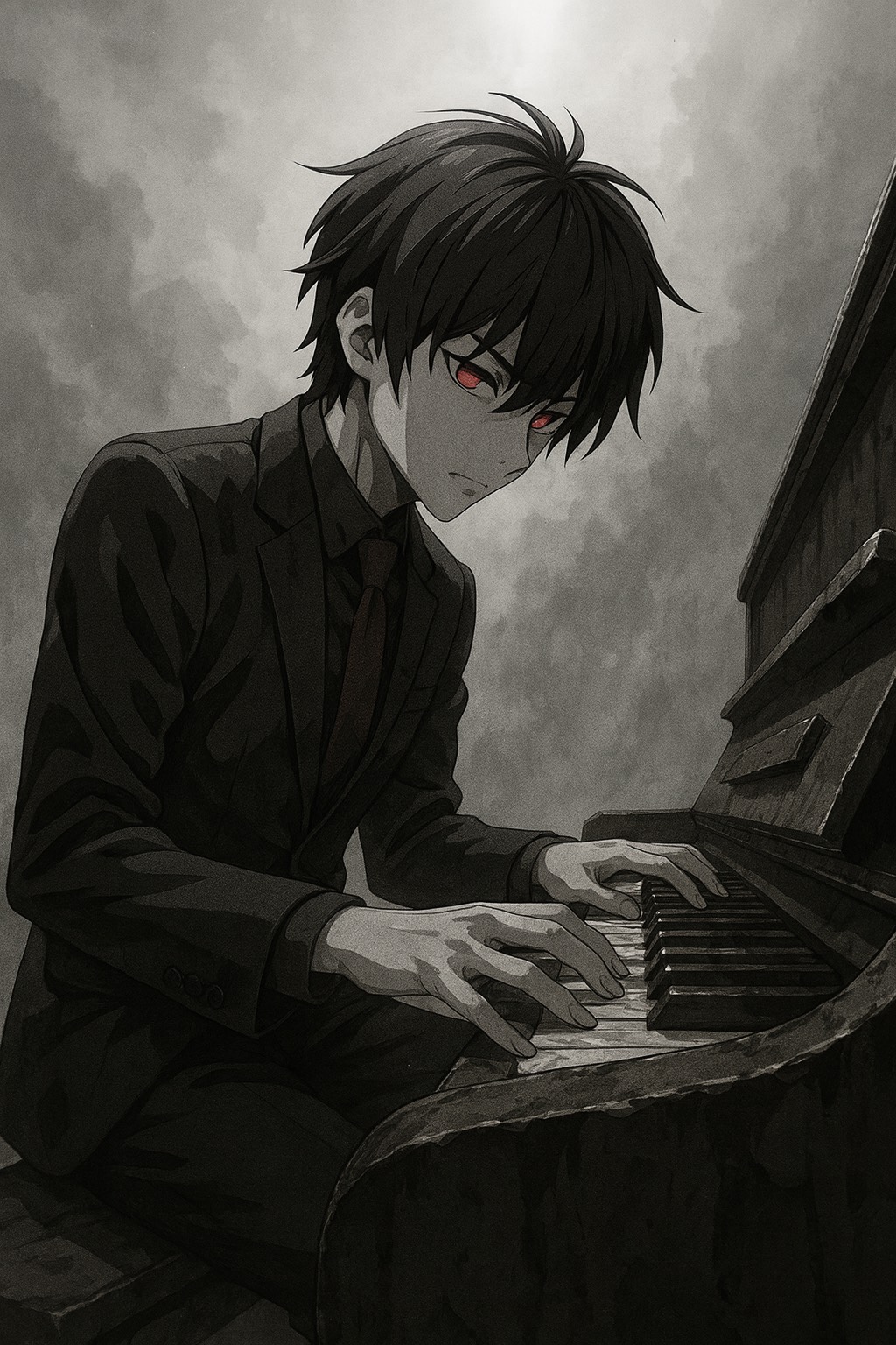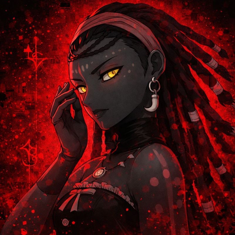 Dark Neoclassical Artcore × Witch House × Experimental Jazz Electronic Remix, haunting neoclassical piano and minor-key harmony, witch house atmosphere with slowed tempo, deep sub-bass, and occult darkness, artcore structure with reverse effects, glitchy transitions, and abstract edits, jazzy swing-infused electronic rhythm, clean yet eerie female vocals with lolicore influence, reversed vocal fragments, heavy reverb, tape saturation, ritualistic, scarlet-colored tragic mood, cinematic tension, experimental sound design, polished and mastered