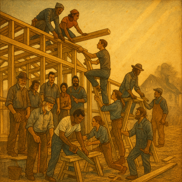A Rustic Grunge / Dirt-Folk Rock Hybrid built on raw acoustic energy and gritty, earth-heavy textures, The song blends Dust-Bowl work-song rhythms with a modern post-grunge edge, Acoustic guitar leads with rough, percussive strums and light overdrive saturation, Low-gain electric guitar adds a dirty halo around the acoustic foundation, Upright bass plays simple, thudding root-fifth lines with a slightly growling tone, Drums emphasize floor-tom thumps, boot-stomp pulses, and brushed snare with a worn, metallic rasp, Harmonica appears in short, wailing accents, sometimes slightly distorted, Fiddle is used sparingly for scratchy, gritty pads rather than sweetness, Vocals are warm, textured, and slightly raspy—storytelling with emotional bite, Harmonies remain raw, unpolished, and close, Overall mood: earthy, muscular, communal, shaped by the imagery of building something new amid decay, Tempo ~82 BPM, Key: G major or D mixolydian