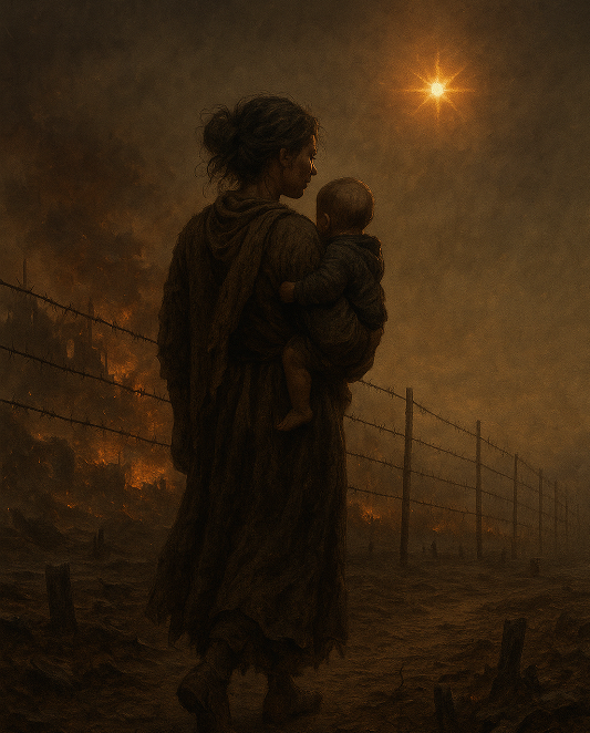 A post-apocalyptic doom-folk / sludge-folk hybrid, The song lives in a scorched, desolate landscape: detuned baritone-acoustic guitar drones, bowed metal, low floor-tom pulses, rusty chain percussion, distant industrial rumble, and a slow doom tempo around 58–64 BPM, Vocals are dark, weathered, intimate, carrying grit without screaming, Bass is distorted, warm, and sluggish, adding a sludge undercurrent, Harmonic minor and modal inflections give a haunted, ancient quality, Atmosphere is bleak but human, with occasional swells of metallic resonance and trembling bowed strings, ‑modern synth pop, ‑EDM, ‑bright gloss, ‑or clean rock sheen