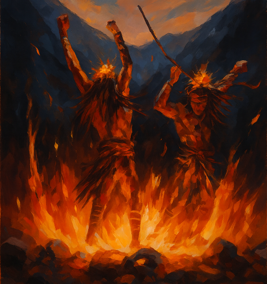 Create an earth-driven neo-folk / post-folk ritual sound full of primal energy and spiritual intensity, 72 BPM, Key: D minor, Use a raw, organic palette: deep frame-drum pulses, tom-like tribal rhythms, bowed-cello drones, hand-bowed dulcimer, breathy wooden flutes, rustling-wind textures, distant thunder, and natural field ambience, Keep everything warm, earthy, and physical, with rough textures and wide reverb like an open landscape, Build dynamic arcs: storm-like surges, ecstatic crescendos, sudden drops into stillness, and luminous dawn-like resolutions, Spoken sections feel like intimate ritual invocations over drones, Vocals should be expressive, earthy, resonant, slightly raw, never pop-smooth, Maintain a sense of ancient-meets-modern: minimal harmonic movement, open fifths, modal inflections, and steady heartbeat percussion, Aim for a spiritual, elemental, windswept feeling with emotional grit and transcendence