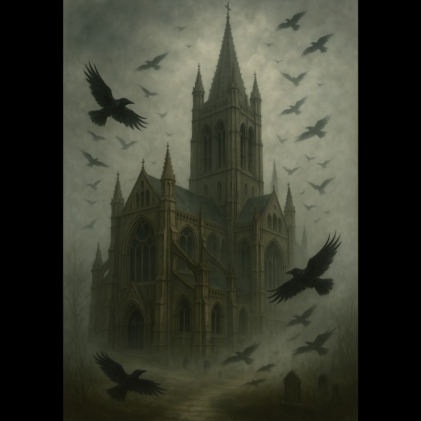 A cappella male choir chants ominously in A minor, haunting, ominous tension thick, Suddenly, the orchestra bursts in—dark strings, brass, and percussion underpinning the voices, Haunting choir motifs recur through surging symphonic verses and choruses, climaxing at a bridge of dissonant, dramatic orchestral swells, ‑music box, ‑solos, ‑female vocals