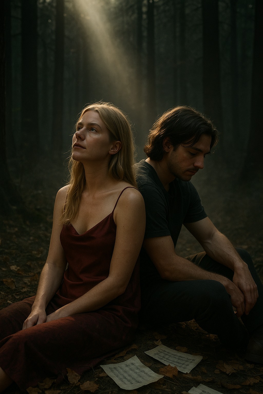 A dark duet, acoustic-driven track with smoky female contralto and male baritone vocals, raw gritty and unrestrained, The instrumentation is centered on heavy, rhythmic acoustic guitars with a percussive, almost tribal feel, layered with moody fiddle, resonant bass, and sparse, earthy percussion, The verses are tense and intimate, vocals husky and soulful, carrying both pain and defiance, The choruses erupt with gritty power, the voice breaking wide open over swelling acoustic walls of sound and harmonies, The overall atmosphere blends Southern gothic and Appalachian folk with raw blues and acoustic alternative rock — haunting, percussive, and deeply emotional, like a storm contained within wood and strings