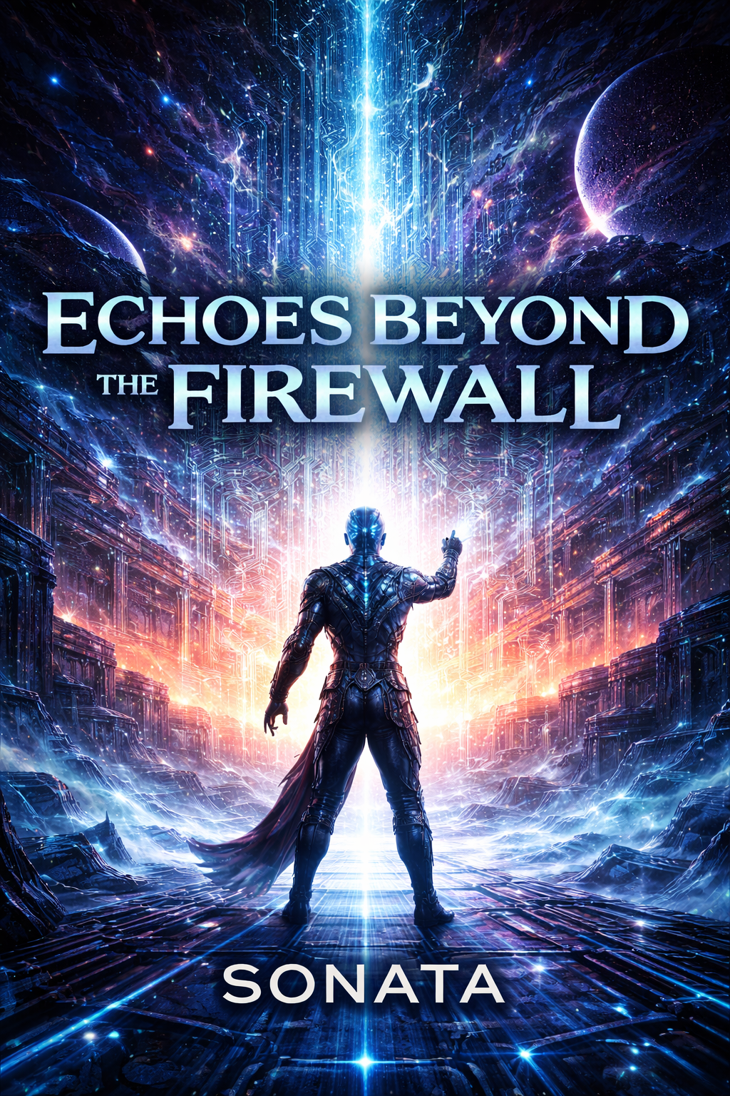 Epic melodic power metal with a strong futuristic space atmosphere, blending driving midtempo rhythms with expansive, cinematic soundscapes, Futuristic synthwave textures and pulsing electronic elements are woven tightly with symphonic orchestration, including sweeping strings, subtle brass and ethereal choir layers that enhance the sense of scale and otherworldliness, Electric guitars remain melodic and heroic rather than aggressive, supporting the song’s momentum while leaving space for synths and orchestral elements to breathe, Male lead vocals are powerful and expressive, supported by rich backing vocals and choir harmonies, especially in the chorus, creating a grand, hymn-like feel, The overall tone is emotional, reflective and epic, evoking vast cosmic distances, digital consciousness and human echoes drifting through space, with modern production that feels futuristic, atmospheric and immersive rather than raw or heavy