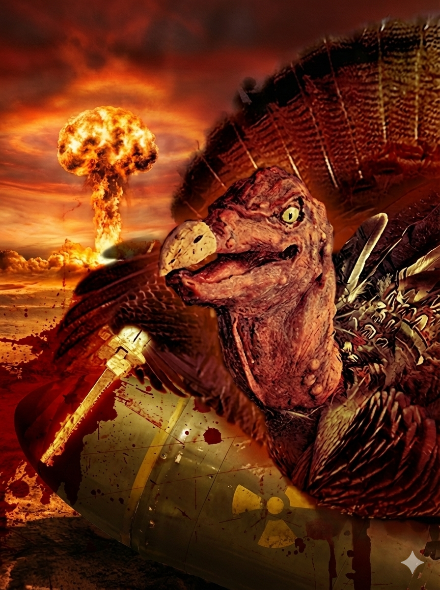Mood: Twisted, Crazy, Cartoony, Dark Comedy, Unsettling, Scary, Genre: A blend of rap and 1920's swing music, Featuring an ensemble of female and male singers, The main character Emcee, the supernatural serial killer turkey, has a foul (fowl) mouth and is to sound demonic and twisted, This, in addition to being full of character, Please include some turkey gobbling FX in at least a few places in this song