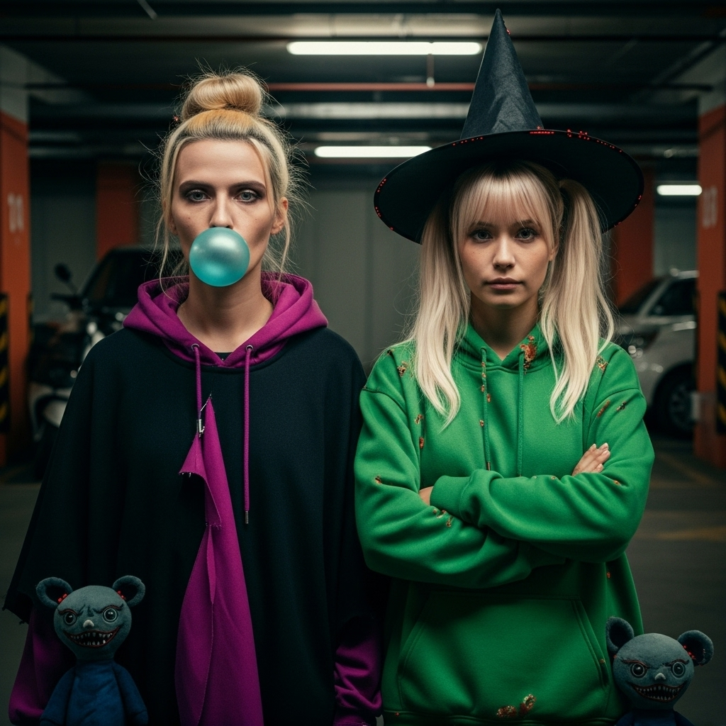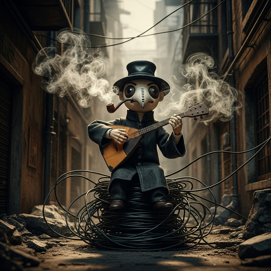 [Music Style: A theatrical Medieval Funk-Rave, The groove is a frantic, relentless assault driven by a fat, funky bassline and a complex rhythm section made entirely of junkyard percussion (clanking metal, scrap hits) and intricate vocal percussion (beatboxing, sharp breaths), Over this, a distorted lute and a wah-wah clavichord trade ridiculously catchy, funky riffs, The sound is dominated by a massive, percussive Murga-style street choir delivering powerful, satirical rave chants and call-and-response hooks, The vibe is a groovy and satirical takedown anthem; the sound of a medieval carnival riot evolving into an apocalyptic rave in the ruins of a forgotten tech startup, ]