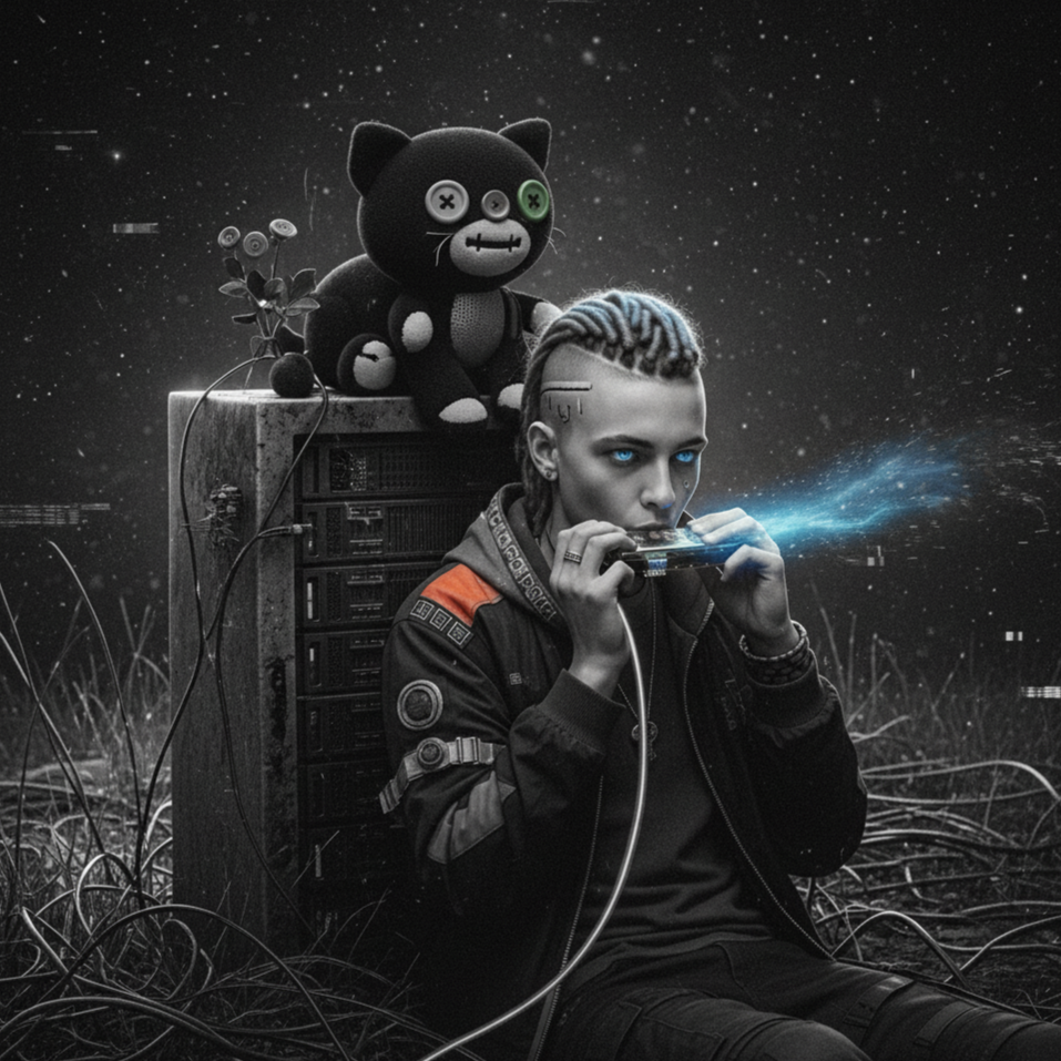[Style: Cosmic Gospel-Funk / Industrial Beatbox, Built on a raw, industrial beatbox foundation, glitchy synth stabs, and a deep, hypnotic funk bassline, Layered with soulful, epic, gospel-style female vocal harmonies, The vibe is a sacred ritual taking place inside a corrupted video game cartridge, Broken, powerful, and supremely catchy, ]