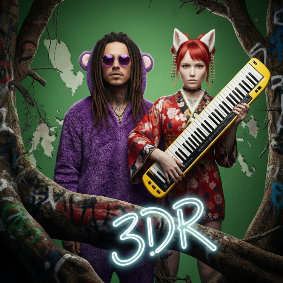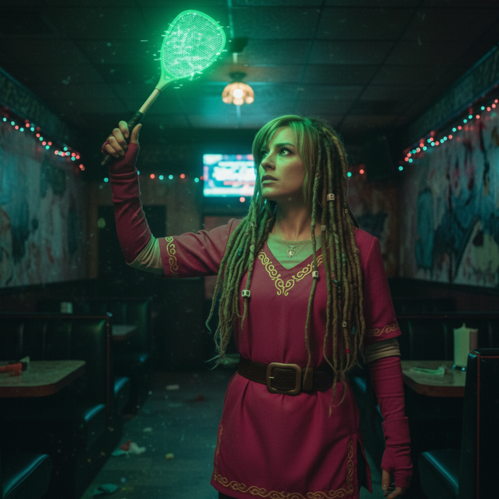 [Style: Cel-Shaded Rave Funk, A hyper-energetic fusion of sweaty funk basslines, surf-rock guitar licks, frantic rave synth stabs, and a hard-hitting hip-hop beat, The vibe is the soundtrack to a final boss battle in a cult classic video game, Dominated by a chaotic, reality-bending toy saxophone that sounds like it's glitching the fabric of the song itself, Insanely danceable, chaotic, and dripping with style, ]
