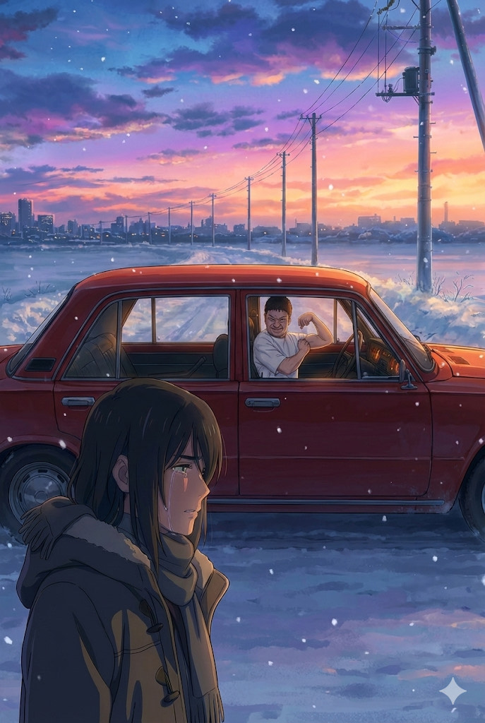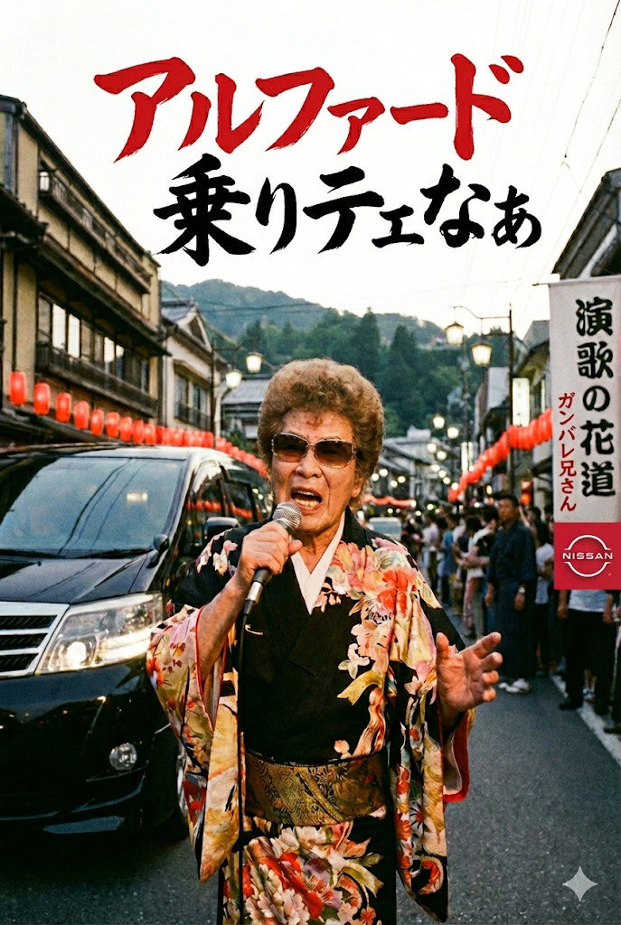 Japanese Enka, traditional Kayokyoku, emotional male vocals, deep voice, heavy kobushi, shamisen, orchestral strings, slow tempo, dramatic, satirical comedy, pathos