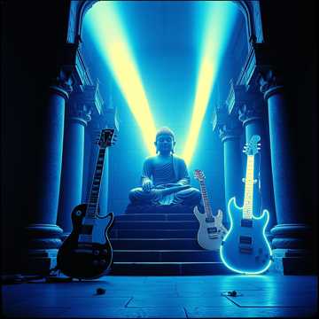 High-energy instrumental battle theme set in neon-industrial cyberspace; high-register electric-guitar lead remains primary while biwa arpeggios escalate from sparse replies to a full interlocking duet; ritual overtones rise as monk-like low choir and temple-bell tolls foreshadow a colossal stone Buddha emerging at the climax; chainsaw-styled rhythmic FX punctuate transitions; an explosive six-hit snare triggers a double-tempo drop where guitar–biwa “crossfire” drives a unison fanfare against power-fifth synths; abrupt, bitcrushed finale, 80s Japanese Video Game Music; Battle Theme; Hard Rock; Heavy Metal; Industrial Rock; Cyberpunk; Dark Synth; High-Register Guitar Lead; Biwa Arpeggio; Ritual; Temple Bell; Chainsaw FX; Angelic vs Demonic; Double Tempo; Cinematic Scale; Instrumental;