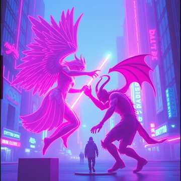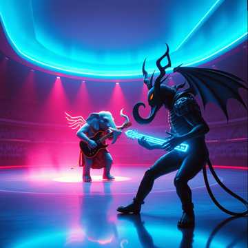 High-energy instrumental battle theme set in a neon-industrial cyberspace where a divine guitarist (Ganesha imagery) duels a digital demon, Distorted lead-synth carries a hostile main riff; a bright, raga-tinged high-register guitar answers in soaring meend slides; biwa arpeggios add crystalline counterlines, Tight straight 8-beat drums drive a melodic counter-bass, Angelic vs demonic timbral call-and-response heightens drama; an acid-bass ramp and chainsaw-style rhythmic FX supercharge the build, An explosive six-hit snare ignites a double-tempo drop as the divine fanfare surges; the demon’s bitcrushed retorts degrade into failure; abrupt bitcrushed finish, 80s Japanese Video Game Music; Battle Theme; Hard Rock; Heavy Metal; Industrial Rock; Cyberpunk; Dark Synth; Driving Bassline; High-Energy; Instrumental; Cyberspace; Angelic vs Demonic; Chainsaw FX; Bitcrush; Acid Bass; Double Tempo; Raga-Inflected Guitar; Biwa Arpeggio; Temple Bell & Conch; Cinematic Scale;