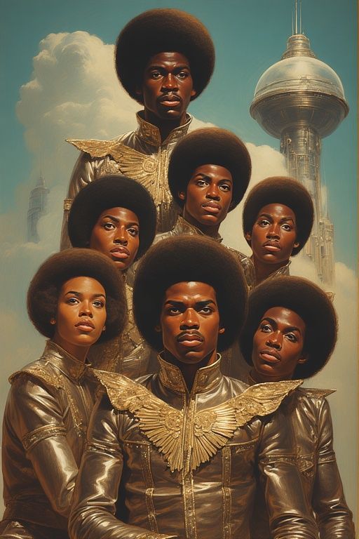 space cantina psychedelic symphony, motown group, funkadelic chior singer lead sci-fi voices, 70's funk bass and drums, fast paced triple time pace, video game 8bit sound bits