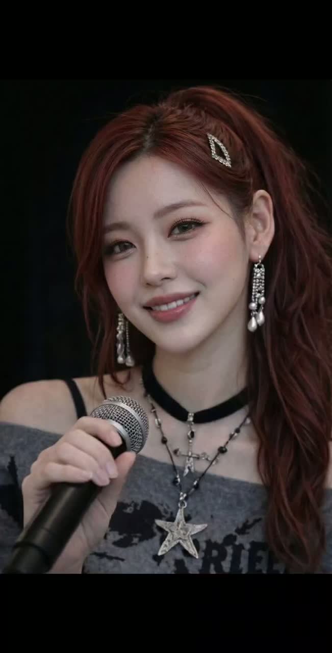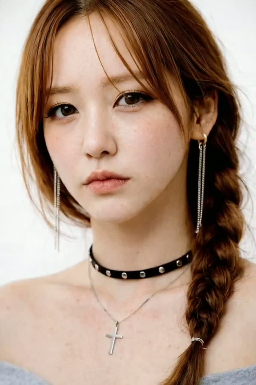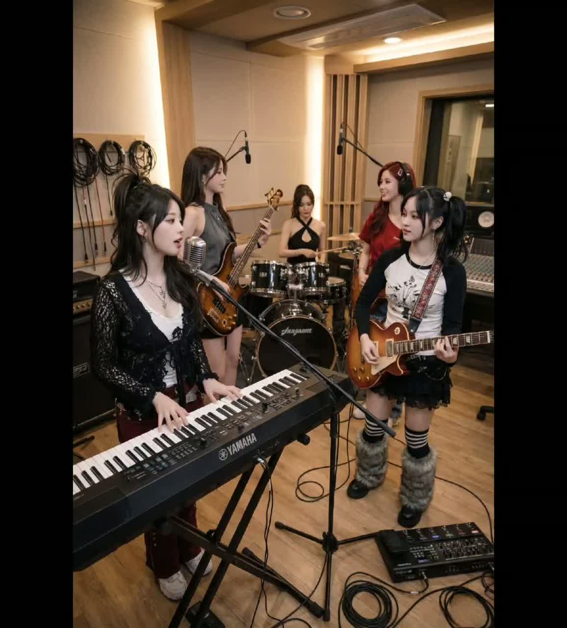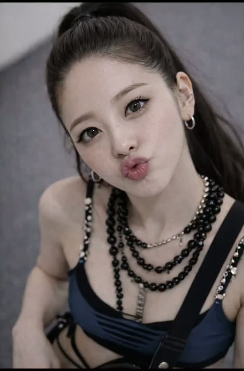 Rhythmic K-pop with fresh alternative pop-rock groove, tempo ~104 BPM, key A minor, dry sound, Female vocalist with rich emotional falsetto and warm chest voice, high-pitch centered, in the style of Jenapop, captured with extreme close-up mic intimacy, Track opens with a sudden minimal drop and whispered “Shh” cue before the groove locks in, Verses use whispery chest tone with playful, rhythmic talk-singing phrasing; smooth chest-to-falsetto transitions throughout, Choruses feature bright layered harmonies, bouncy articulation, and soaring falsetto high notes with controlled vibrato; ad-libs are cheeky, sigh-like, and intimate, Instrumentation: tight strum-based steel-string acoustic guitar (close-mic, audible string scratch and subtle body hits), electric guitar with expressive wah-pedal rhythmic comping, slap bass driving a stylish melodic bassline, and light, fresh drum kit with crisp kick and snappy snare, Interlude spotlights slap bass and wah guitar interplay, ‑ambient, ‑reverb