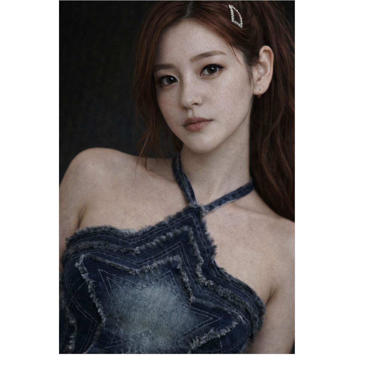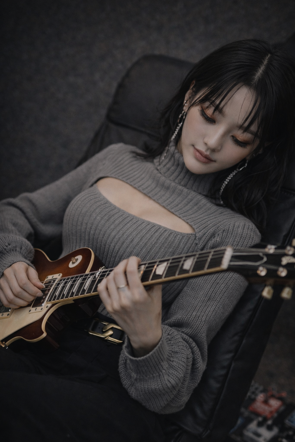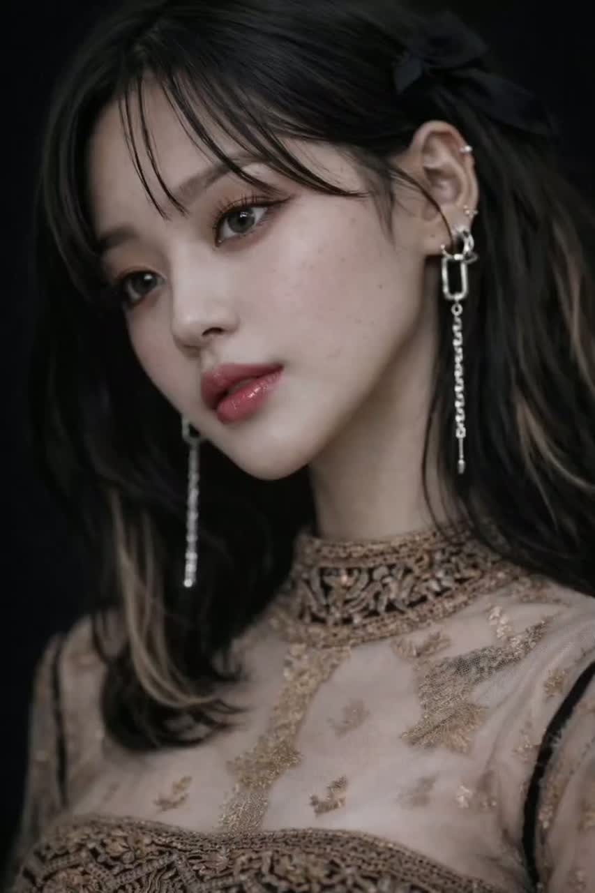 Rhythmic K-pop with fresh alternative pop-rock groove, tempo ~104 BPM, key A minor, dry sound, Female vocalist with rich emotional falsetto and warm chest voice, high-pitch centered, in the style of Jenapop, captured with extreme close-up mic intimacy, Track opens with a sudden minimal drop and whispered “Shh” cue before the groove locks in, Verses use whispery chest tone with playful, rhythmic talk-singing phrasing; smooth chest-to-falsetto transitions throughout, Choruses feature bright layered harmonies, bouncy articulation, and soaring falsetto high notes with controlled vibrato; ad-libs are cheeky, sigh-like, and intimate, Instrumentation: tight strum-based steel-string acoustic guitar (close-mic, audible string scratch and subtle body hits), electric guitar with expressive wah-pedal rhythmic comping, slap bass driving a stylish melodic bassline, and light, fresh drum kit with crisp kick and snappy snare, Interlude spotlights slap bass and wah guitar interplay, ‑ambient, ‑reverb
